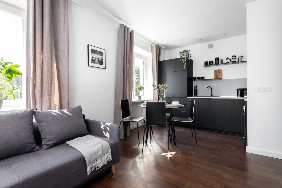 Ný, þægileg íbúð, mjög nálægt miðbænum. Íbúðin er 33m2 og samanstendur af stofu með borðkrók og eldhúskrók, sér svefnherbergi og baðherbergi með sturtu. Húsnæðið er hagnýtt og búið nauðsynlegum búnaði. Íbúðin er staðsett á vel tengdu svæði. Nálægt er neðanjarðarlestarstöð, sporvagns- og strætisvagnastoppistöðvar. Við bjóðum upp á bílastæði á staðnum á 50 PLN á dag (athuga þarf framboð í hvert sinn).