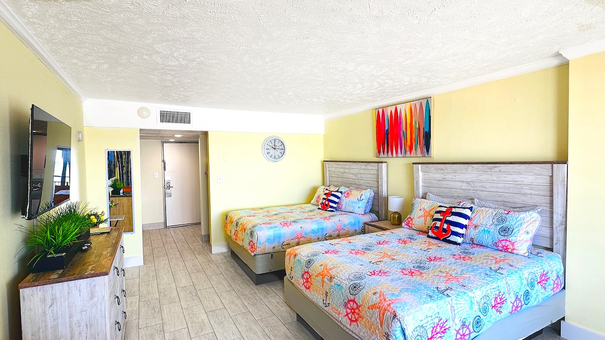 Þessi 2ja herbergja svíta, hluti af Shore Crest Vacation Villas meðfram Atlantshafinu, rúmar frá 4 til 6 gesti í þægindum og stíl, með fullbúnu eldhúsi og 2 baðherbergjum, hjónaherbergi, gestaherbergi, aðskildri stofu (með svefnsófa fyrir tvo) og borðstofum og svölum. Það býður upp á þægindi á dvalarstað eins og inni-/útisundlaugar, inni-/úti heita potta, líkamsræktarherbergi og ókeypis bílastæði. Þessi eining er með sjávarútsýni að hluta en ekki sjávarútsýni.