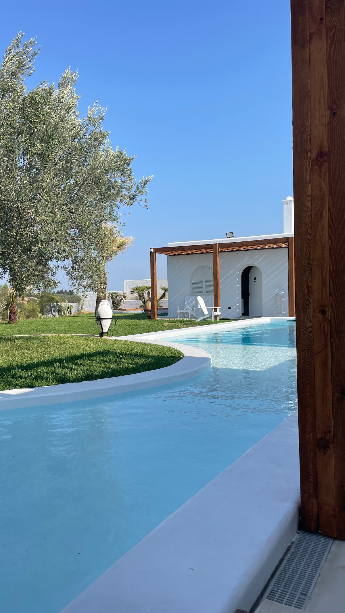 Uppgerð einkaríbúð í hreinum, minimalískum stíl Hammamet og endurskoðuð í Mykonos-stíl (krosshvelfingar, svart smíðajárn) • Sameiginlegt svæði með stofu, borðstofusvæði sem snýr að stórri sundlaug. Svefnherbergi með loftkælingu, það er einnig með viftu í art-deco stíl sem hangir yfir einkasundlaug. Rúmið er byggt í Mykonos-stíl. Gólfið er málað með hvítri epoxýmálningu í þessari friðsælu og miðlægu gistingu. Stofan er með útsýni yfir fallega verönd.