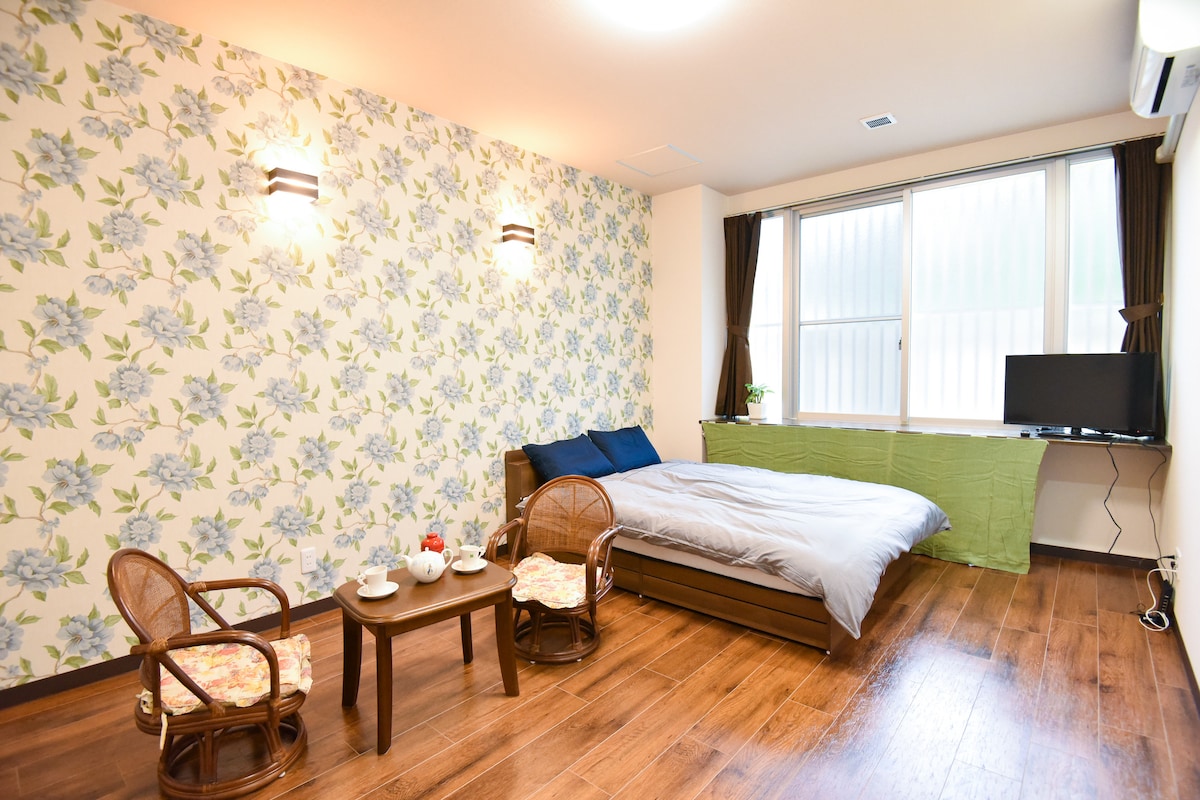Miebashi-stöðin er í 4 mínútna göngufjarlægð.Fyrir framan matvöruverslunina.2 tvíbreið rúm.Þvottavél/þurrkari er til staðar