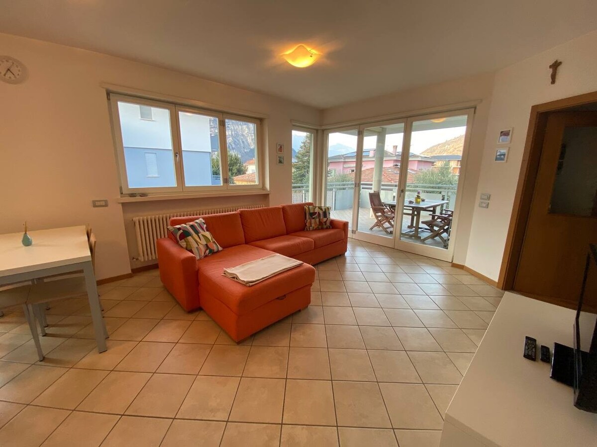 Ótrúleg 100 m2 íbúð á 3. hæð í þriggja hæða húsi í sögulegum miðbæ Torbole, 100 metrum frá Garda-vatni. Notalegt með svölum með útsýni yfir stöðuvatn, 3 svefnherbergi (eitt með möguleika á þriðja rúmi án endurgjalds) 2 baðherbergi + sturta, stofa / borðstofa og eldhús með örbylgjuofni og uppþvottavél. Læst herbergi í innri húsagarðinum fyrir brimbretti og reiðhjól þar sem einnig er laust bílastæði (1 bíll, engir sendibílar) 10% afsláttur af gistingu sem varir lengur en 7 nætur.