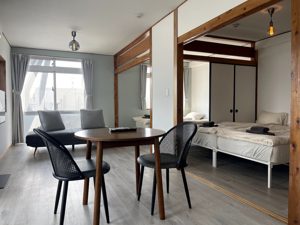 500m frá Kokusai-dori | 2 svefnherbergi í japönskum stíl + stofa | Mögulegt innigrill, margir izakayas