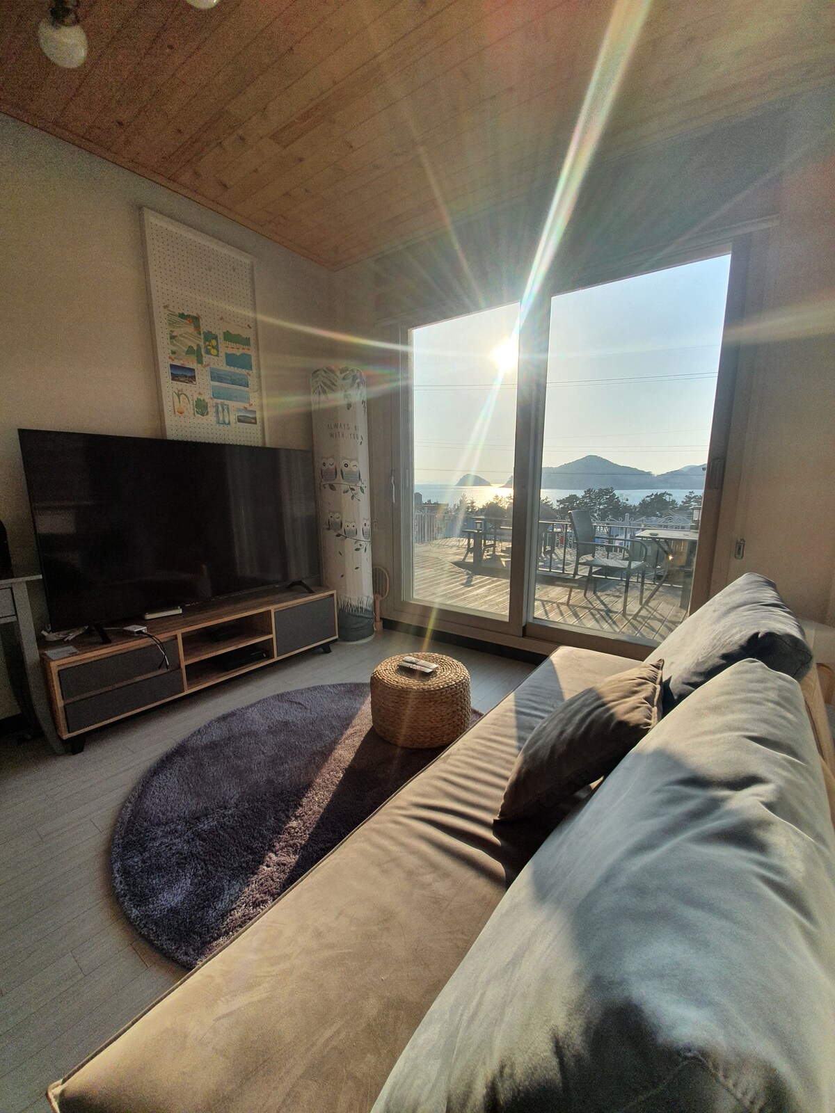 Þú getur notið útsýnisins yfir fjöllin í gegnum allan gluggann sem er umkringdur Mongdol-strandhafinu og hlíðum Namhae Cheonha-þorpsins.Slappaðu af í þessu rólega og stílhreina fríi. Þetta er þaklífeyrir þar sem þú getur slakað á meðan þú horfir á sjóinn frá rúmgóðu þakinu og séð stjörnurnar í sjónum á kvöldin og stjörnurnar svífa í sjónum á kvöldin. Það er það besta meðal Namhae Barae-gil, sem tengist Namhae Pyeonbaek Tree Recreation Forest og Eunmorae Beach í Sangju. Leið 40 og 41 er tengd frá framhlið hússins. Lífsbraut sjávarstígsins þróast. Mundu að ganga. Dýfðu þér í baðkerið og slappaðu af með einkaútsýni yfir þreytu dagsins. Við sjáum um hjartað með bestu þægindunum. Njóttu kvöldgrillsins með elskhuga þínum, vinum og fjölskyldu um leið og þú horfir á hið fallega Namhae-haf. Morgunverðarþjónusta í boði Við bjóðum upp á hollan morgunverð eins og salöt/beyglur, egg og rjómaost með fersku grænmeti og árstíðabundnum ávöxtum.✨️✨️