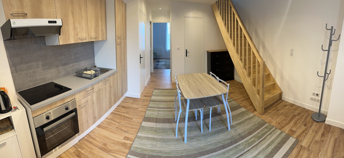 Dupleix í miðborginni nálægt öllum stöðum og þægindum (veitingastaðir, krossgötur, slátrari, apótek, bókabúð, bakarí, pósthús) 10 mín gangur frá rútustöð (600m) 45 mínútur með lest til Parísar Gare de l 'Est. Endurbætt og fullbúið gistirými: eldhús með ofni, helluborð, ísskápur með frysti, hjónarúm uppi með sturtuklefa og salerni, 2 svefnsófi í stofunni með sjónvarpi