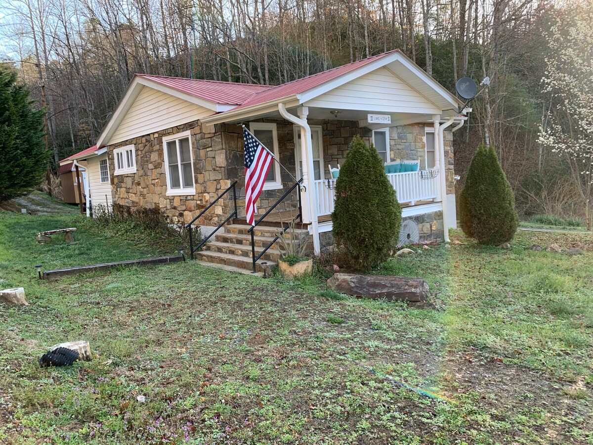 Newly redecorated, wonderfully rustic, & simply charming rock cottage family home with lake view & a creek running beside it, directly off a main road (no steep driveways). Just at .6 miles to the Alarka Boat Ramp & Marina, less than ten miles to downtown Bryson City, 20 minutes to Nantahala Outdoor Center, under 20 miles to Cherokee & Harrah's casino, 30 miles to The Dragon's Tail. Enjoy sunrises and sunsets on the front porch while waving to passing vehicles (most likely a family member!).