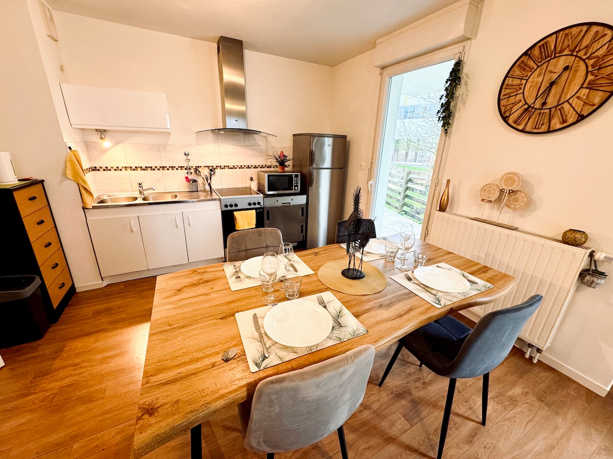 Verið velkomin í „Jardin Secret“, 5★ athvarf (með einkunnina Atout France, Ministry of Tourism) í hjarta Nantes. Þessi bjarta 85m² íbúð býður upp á 2 svefnherbergi, úrvalsrúmföt, notalega mezzanine, fullbúið eldhús og 80m² einkagarð með skyggðri verönd. Óvarin steinsteypa, hátalarar, hratt þráðlaust net og örugg bílastæði fylgja. Steinsnar frá bestu stöðunum og verslununum í Nantes. Aukabúnaður í boði: síðbúin koma/brottför, ýmsir pakkar. Fullkomið fyrir þægilega og ósvikna gistingu. Bókaðu núna!