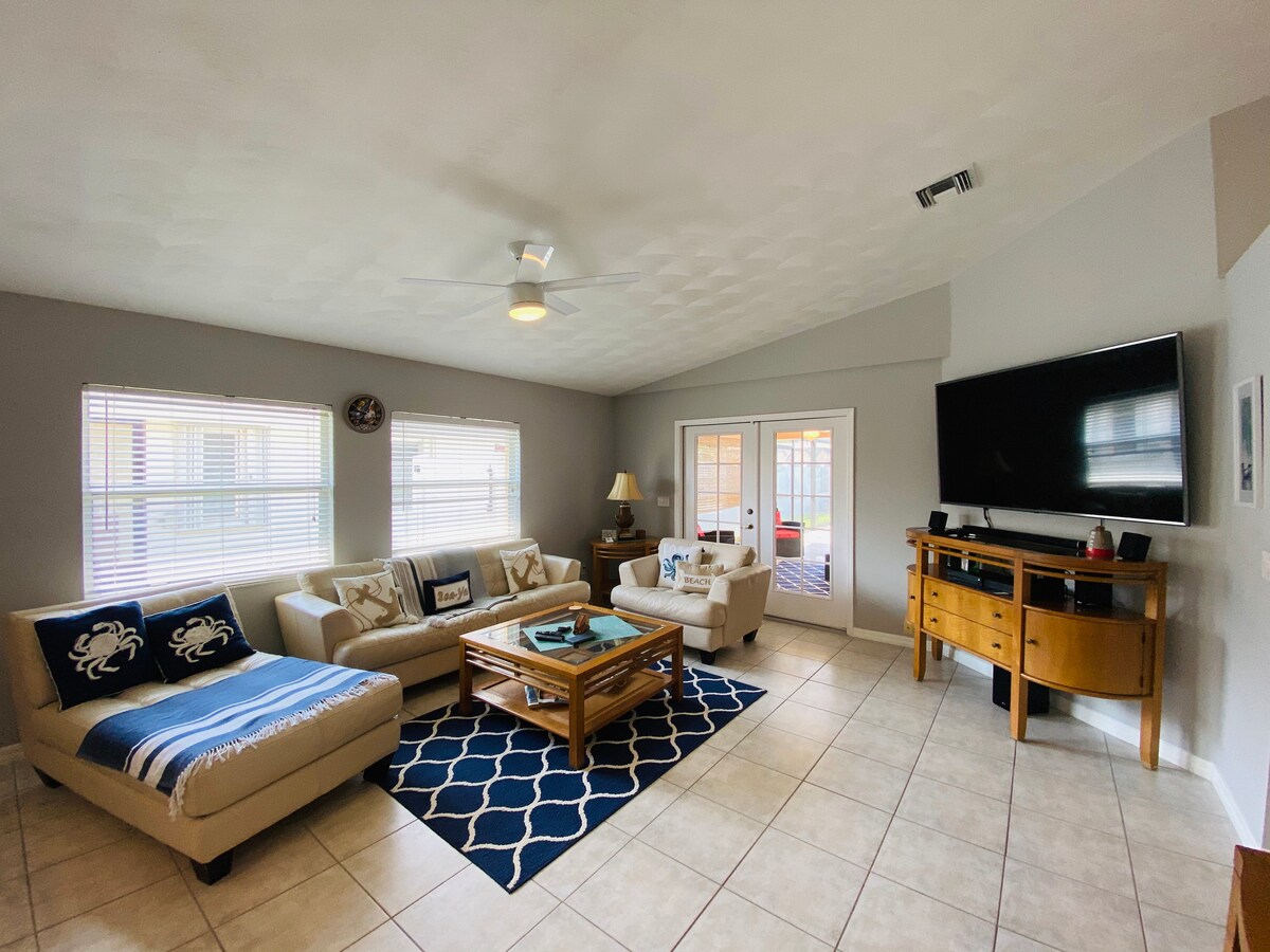 Saltwater Pool & Spa, This 4 bedroom 2 Baths has privacy but close to ALL! Comfortable living area drenched with natural light. Kitchen is well appointed to whip up your favorite meals. Enjoy long meal or games inside or outside. 4 desk spaces for school or work from home. We have many things for kids! Highchair, oversized pack-n-play, toddler table & chairs, step stools, floor potty, folding tub, TOYS and more. Swing set outside. Walk or bike to beach! Relax and enjoy! pets welcome!