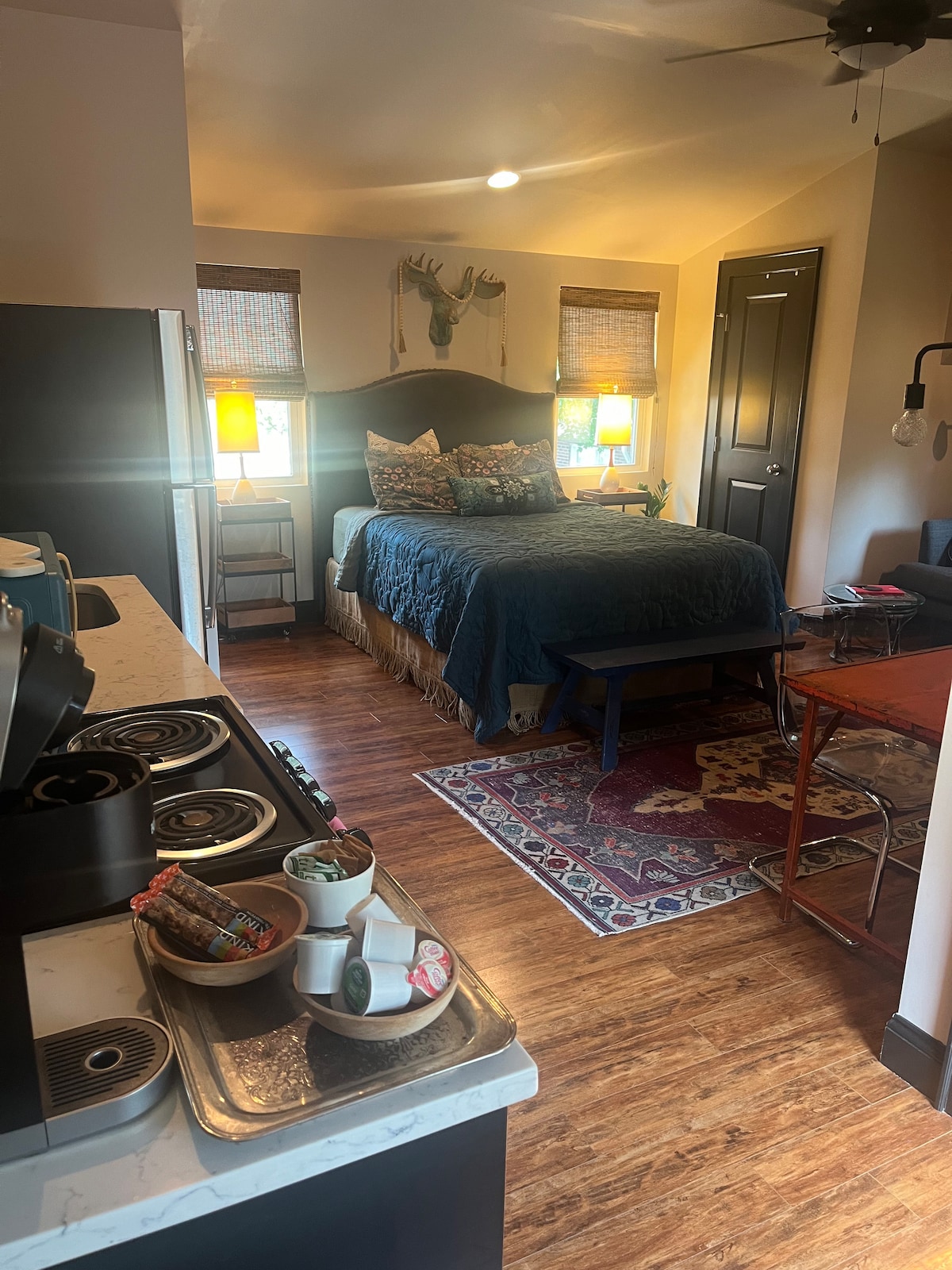 There are three other flats on site, Keswick Loft, Keswick Studio, and Keswick Tiny House. You can find them by zooming into the map at the Suite's location. Keswick Retreat is a serene space in a quiet neighborhood near the heart of uptown. The Retreat has large glass doors with lovely views of the surrounding trees that makes the unit feel like a treehouse. Custom details make Keswick Retreat a peaceful and sophisticated place to stay.