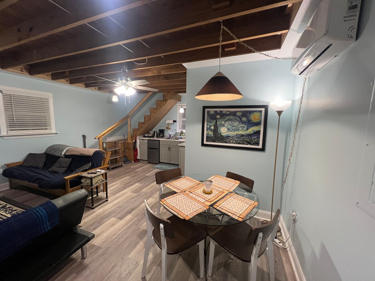 Welcome, friends! Nestled in the lovely scenery & solitude of beautiful Sunset Park, this newly-remodeled two-story barn is the perfect getaway spot! Close to everything yet tucked into a quiet wooded area behind my house, you’ll look out the window to find the wide open green space of the park. Take a stroll to such spots as City Lake, the disc golf course, dog park, Chico’s Mexican Restaurant, and much more. You’ll be only a mile away from Historic Downtown and the Rocky Mount Mills campus!