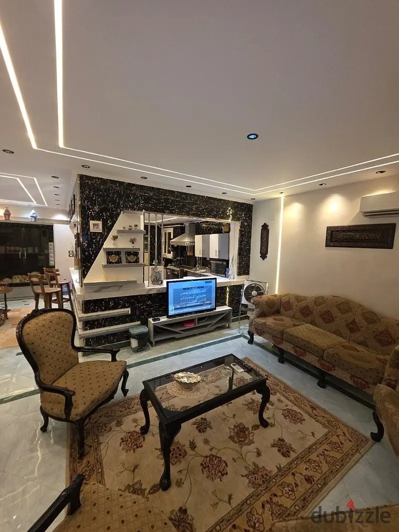 Uppgötvaðu þessa nýuppgerðu, rúmgóðu og heillandi 5 herbergja villu á frábærum stað, beint á móti 5A, U-Venues og Square One og í aðeins 5 mínútna fjarlægð frá Cairo Festival City Mall og Downtown Mall. Villan er með 4 en-suite baðherbergi, risastórt fullbúið eldhús og gríðarstóran fallegan einkagarð með verönd. Eitt svefnherbergið er einkasvíta á eigin hæð með aðgangi að stóru þaki sem veitir aukið næði og pláss. Tilvalið fyrir fjölskylduhópa.