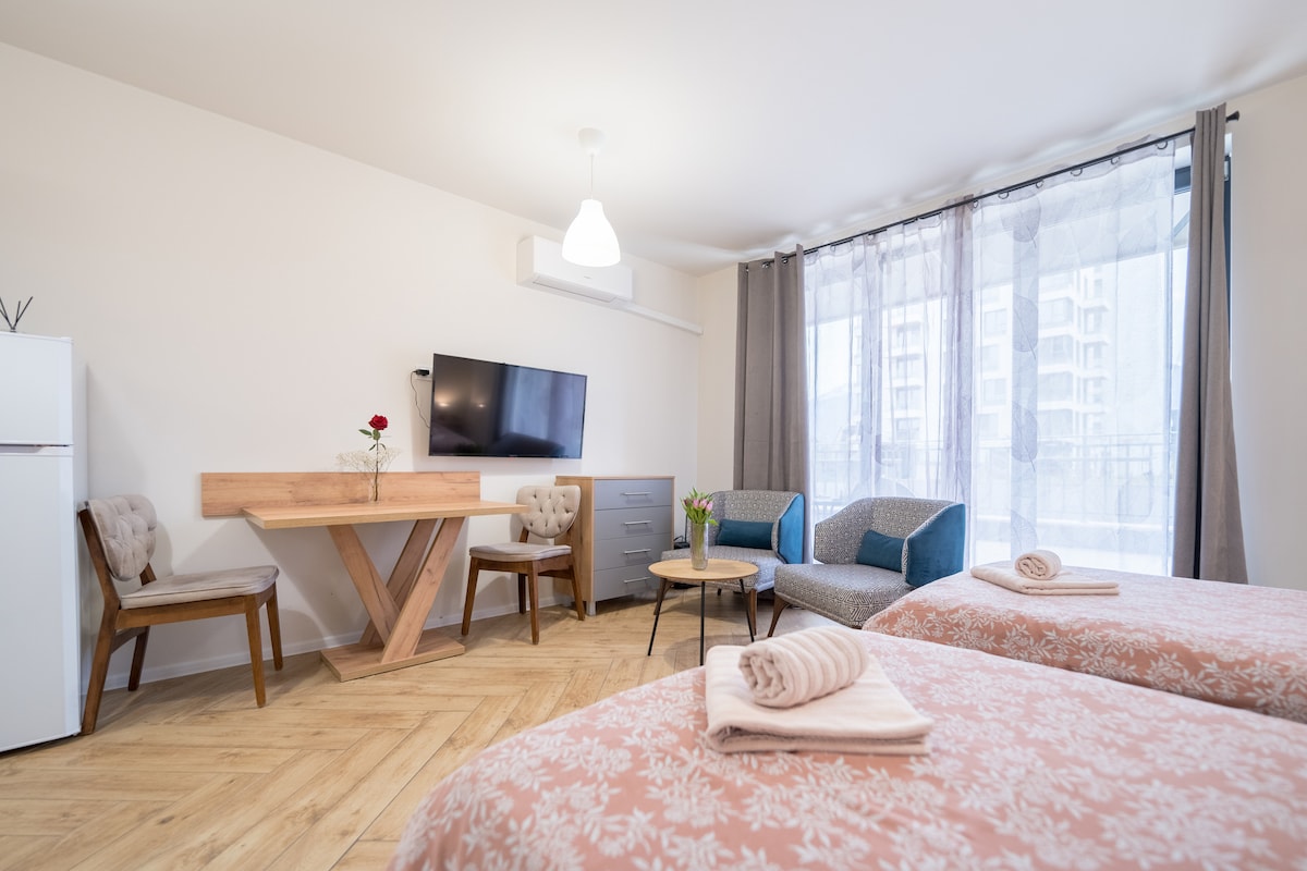 Gististaðurinn þegar þú ert í Sofíu! Komdu og njóttu lúxusupplifunar í þessari glænýju byggingu í Studenstki-gráðu sem býður upp á lúxus og stílhreinar innréttingar, fullbúið svefnherbergi, eldhús og baðherbergi með öllu sem þú þarft fyrir þægilega dvöl. Byggingin er staðsett við hliðina á University of National and World Economy (УНСС) og er einstök með heildrænni nálgun við að leysa íbúðarþarfir þínar; allt frá snurðulausu innritunarferlinu til þægilegs og afslappandi svefns.