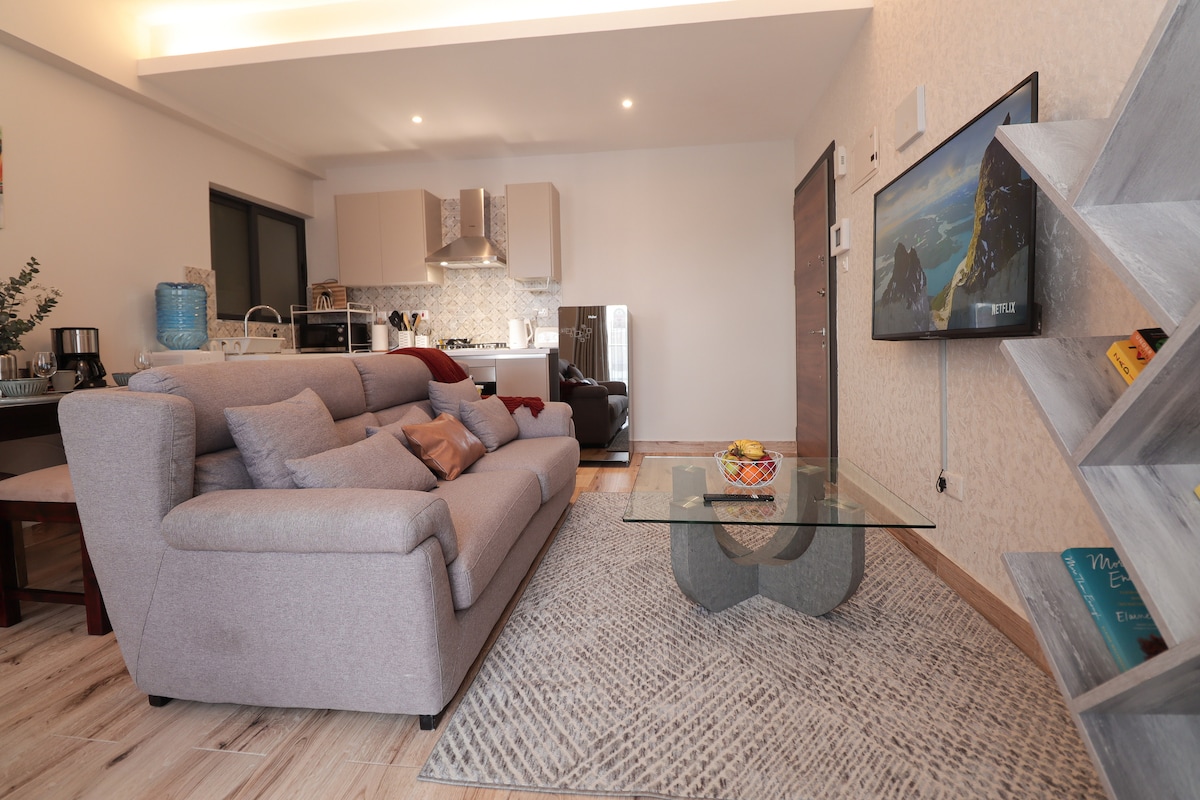Stílhrein og nútímaleg aprt með 1 svefnherbergi er fullkomin fyrir ferðalanga sem eru einir á ferð,pör eða gesti í viðskiptaerindum sem vilja þægindi og þægindi. Í öruggri byggingu er einstakur aðgangur að úrvalsþægindum, þar á meðal heitri þaksundlaug, fullbúinni líkamsrækt og háhraða þráðlausu neti. Slappaðu af í mjúku queen-rúmi,þægilegum sófa og streymdu uppáhaldsstöðunum þínum á Netflix. Hrein og minimalísk fagurfræði sem er samstundis eins og heimili. Heit regnsturta, vel búið eldhús með nægri dagsbirtu fullkomna upplifunina.