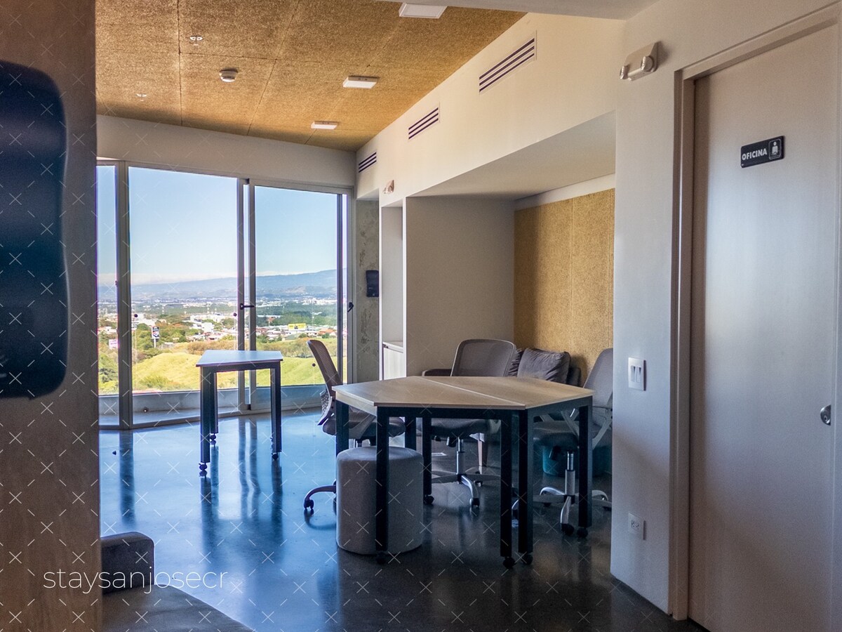 Lúxusíbúð með loftræstingu, notaleg og fullkomlega staðsett í hjarta borgarinnar. Þetta fullbúna rými, með nútímalegum og fáguðum skreytingum, veitir þér frelsi til að búa örugglega og þægilega um leið og þú skoðar allt sem borgin hefur upp á að bjóða. Nálægt ferðamannastöðum, bönkum, matvöruverslunum og veitingastöðum. (Í íbúðinni eru 8 veitingastaðir í aðstöðunni) Alþjóðaflugvöllurinn (SJO) er í 20 mínútna fjarlægð, La Sabana Park og nýi þjóðarleikvangurinn eru í 3 mín fjarlægð í San Jose.