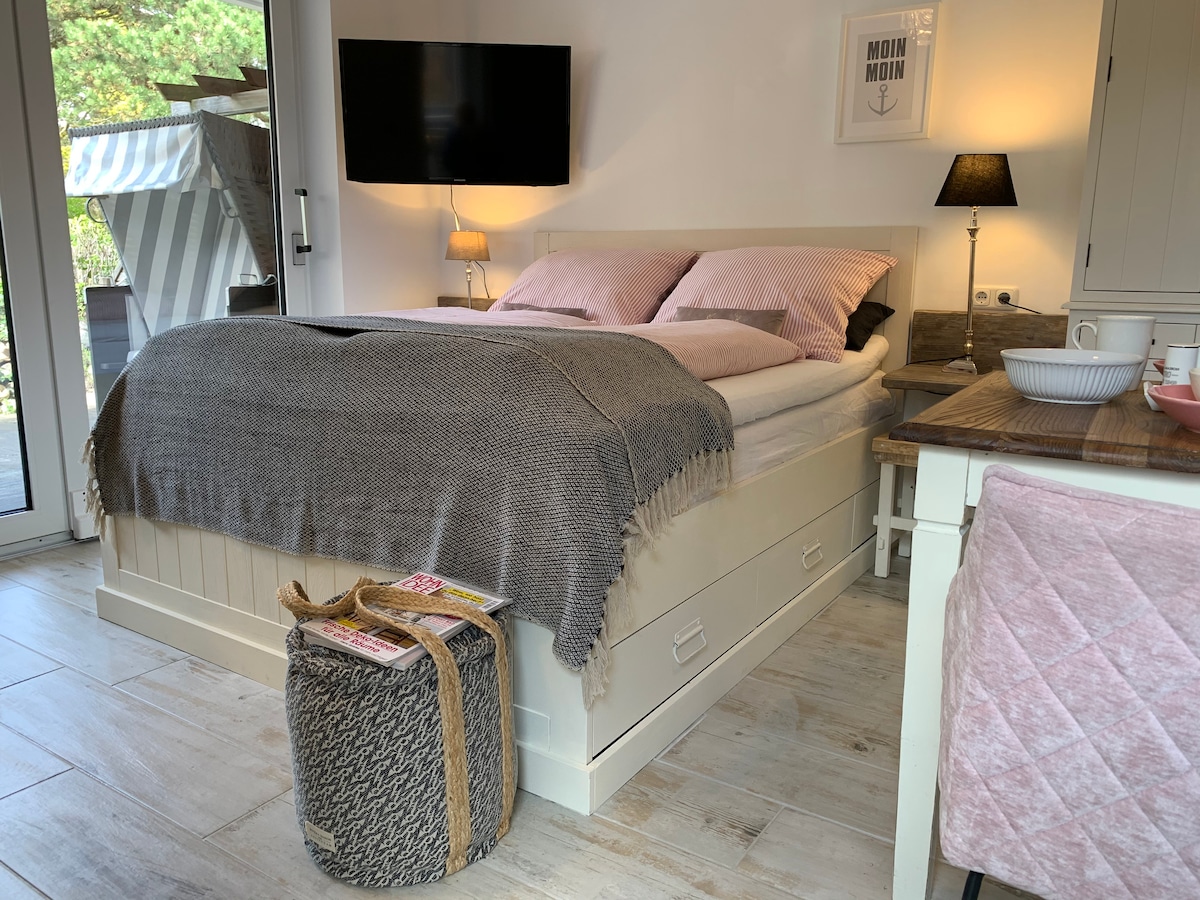 Á draumastað - 150 metra frá fallegustu strönd Norður-Strander, Fuhlehörn - er heillandi North Beach Nixenhaus með tveimur íbúðum. Þessi litla íbúð á jarðhæð hentar fullkomlega fyrir tvo. Þrír geta gist hér ef óskað er eftir því. Þriðji gesturinn gæti sofið í kerinu undir stiganum. Hægt er að loka svefnherberginu með hurð. Fyrir ofan þessa íbúð við sjóinn er Nordstrandnixe staðsett á landi.