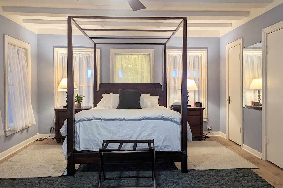 Upphaflega vinnandi Cobbler 's Barn á fjórða áratug síðustu aldar og síðan endurgerð að fullu og breytt árið 2021. Nú er rýmið nútímalegt en heldur samt upprunalegum karakter og sjarma. Er með AC, mjög þægilegt queen-rúm, fullbúið eldhús með eldavélarhellum, örbylgjuofni, litlum ofni og litlum ísskáp. Baðherbergi með fallegum stórum hégómaljósum og vel upplýstri sturtu. Ef þú dvelur lengur en 30 daga bjóðum við upp á þvottaþjónustu án endurgjalds .