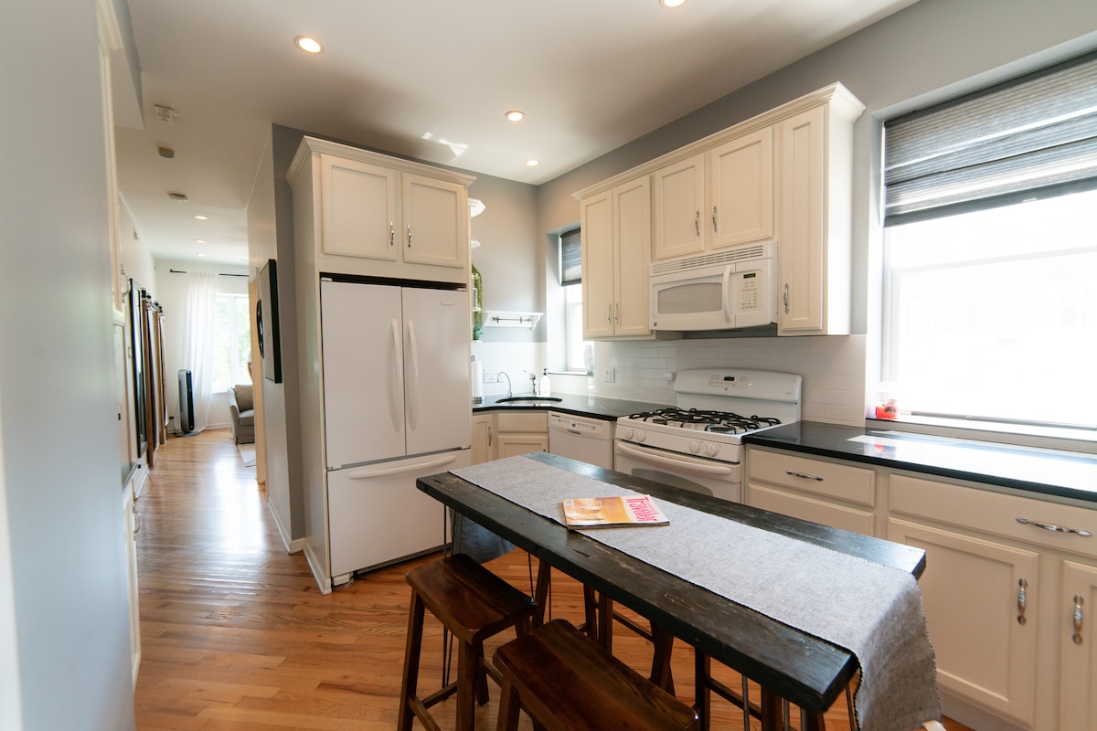 Þessi bjarta og rúmgóða 2 svefnherbergja/2 baðherbergja íbúð hefur verið endurnýjuð að fullu með hönnunarauga og skapandi yfirbragði. Íbúðinni fylgir 1 bílastæði á aðliggjandi einkabílastæði með hliði. Yfirbyggða veröndin á bakveröndinni býður upp á magnað útsýni yfir sjóndeildarhring Chicago. Njóttu morgunkaffisins eða kvöldkokkteilsins með útsýni yfir borgina. L Train Stops & fullt af veitingastöðum, börum og afþreyingu í göngufæri. Vinsamlegast hafðu samband við mig til að fá afslátt af langdvöl!