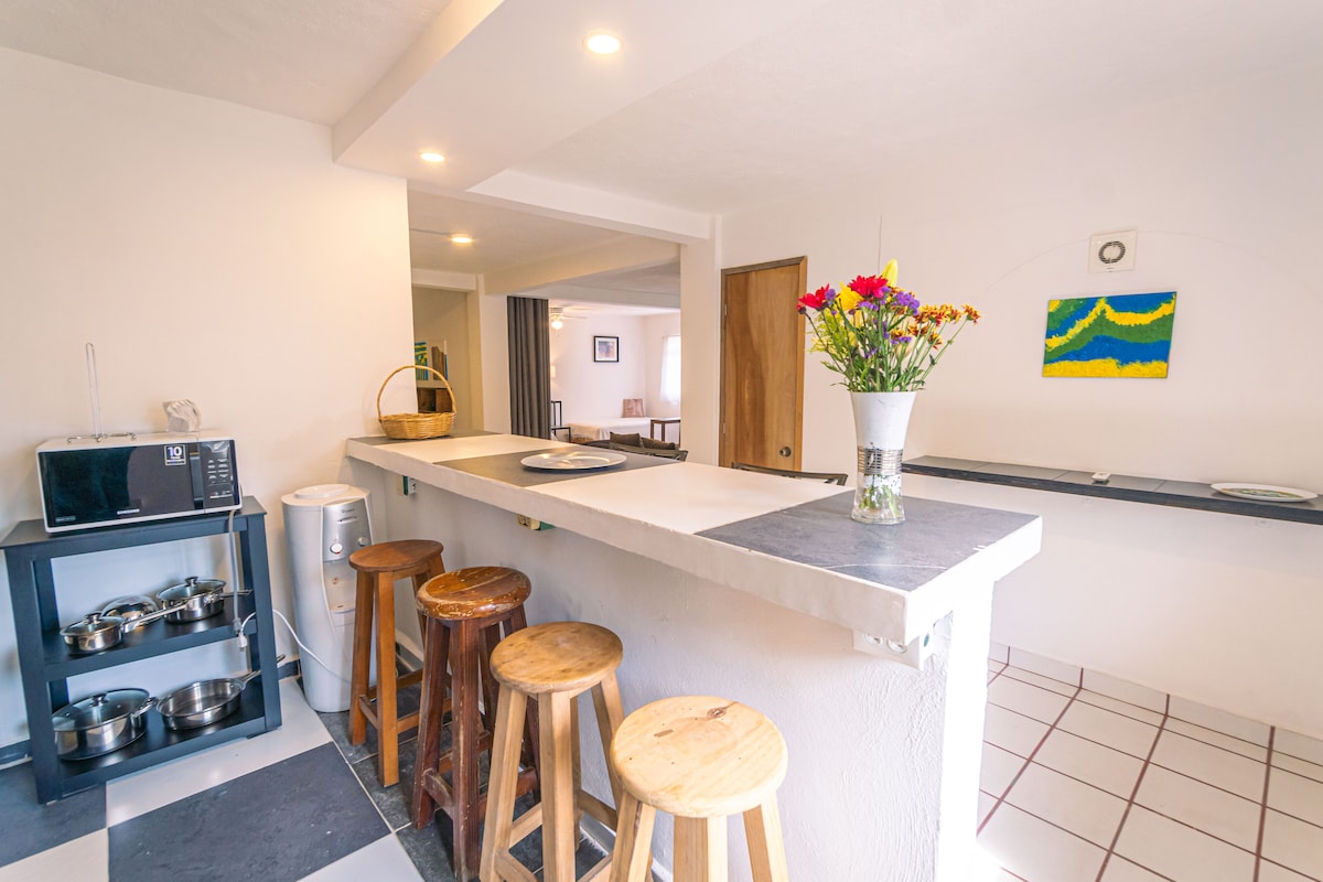 Punta Mita, Nayarit Öll íbúðin 38 m2 40 km frá Puerto Vallarta flugvellinum, 15 mínútur frá Sayulita og La Cruz de Huanacaxtle. Það hefur tvö queen rúm, A, búin eldhúskrók, gott sameign með lítilli sundlaug, rými fyrir hvíld og slökun. Tvær blokkir frá ströndinni, nálægt bestu brimbrettastöðum og öðrum upplifunum nálægt bestu ströndum . Punta Mita býður upp á mikið úrval af veitingastöðum til að njóta fyrir framan eða nálægt sjónum.