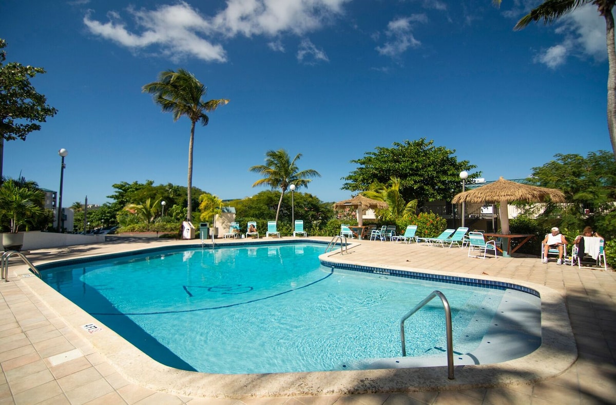 Fallegt sjávarútsýni. Stúdíó á efstu hæð með svölum í Sapphire Village er upplagt fyrir tvo gesti og með queen-rúmi. Eldhús og einkasvalir með mögnuðu útsýni. Fimm mínútna ganga að Sapphire Beach, tveimur stórum sundlaugum, tveimur frábærum, afslöppuðum veitingastöðum, kaffihúsum, leigubílastöðvum og þvottahúsi á staðnum. Við höfnina eru nokkrir ferðavalkostir fyrir daga til að halda dögunum fullum. Siglingar, fallhlífarsiglingar eða leiga á ölduhlaupara. Allt sem þú þarft er í eigninni.