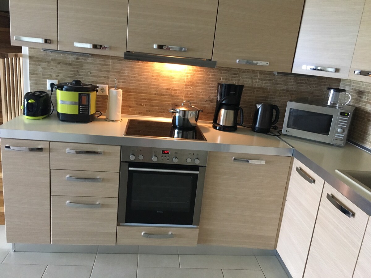 An apartment with a spacious balcony with a view. It sleeps comfortably up to 5 guests. Only 150 metres from the sandy beach and restaurants and thee minutes walk from the local bakery and supermarket. It benefits from a fully equipped kitchen, a spacious open plan lounge/dinner, two bedrooms with comfortable antique style beds, and a large wardrobe. One of the bedrooms has a double bed. The apartment is fully air conditioned, offers free WiFi, free parking and a garden with a barbecue.