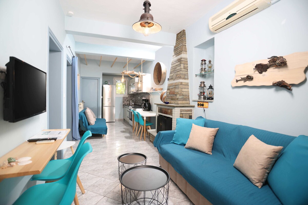 Tveggja herbergja þægileg íbúð á jarðhæð (5 manns), 200 m frá sandströnd, fallega staðsett, með útsýni yfir flóann, umkringd ávaxtatrjám og furu. Með 2 A/C og flugnanetum erum við með fullbúið eldhús (eldhús með eldavél, uppþvottavél, örbylgjuofni, kaffivél, brauðrist, katli og þvottavél). Leiksvæði fyrir litlu gestina okkar! Með einkabílastæði ÓKEYPIS ÞRÁÐLAUST NET (getur einnig tengst með ethernet-snúru) Aðeins 90 km frá flugvellinum í Þessalóníku.