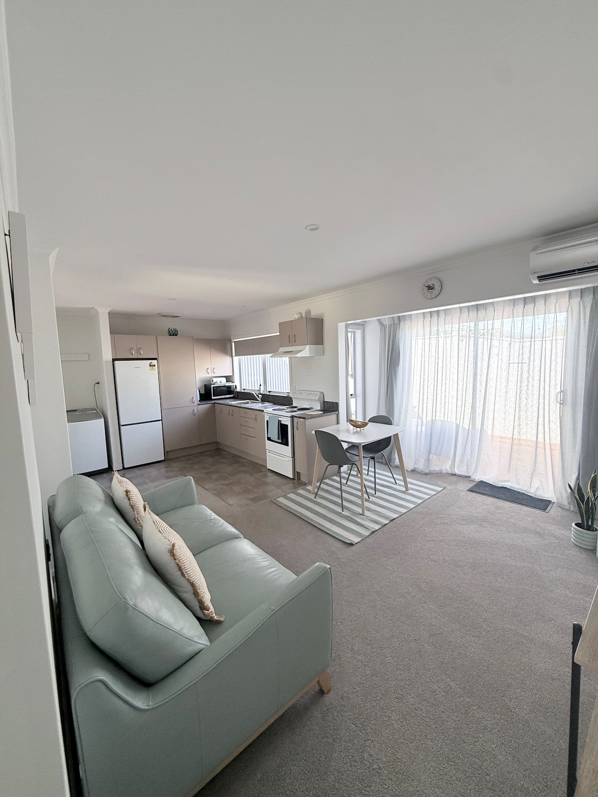 Relax in this quiet, stylish hillside apartment with parking at the door. French doors open to a sunny private patio and lawn with BBQ. Enjoy sea views, native birdlife, and beautiful sunsets. Includes a full kitchen, private laundry, bathroom with bath & shower plus separate WC. Two queen bedrooms with electric blankets (Apr–Nov) and air conditioning/heating for year-round comfort.