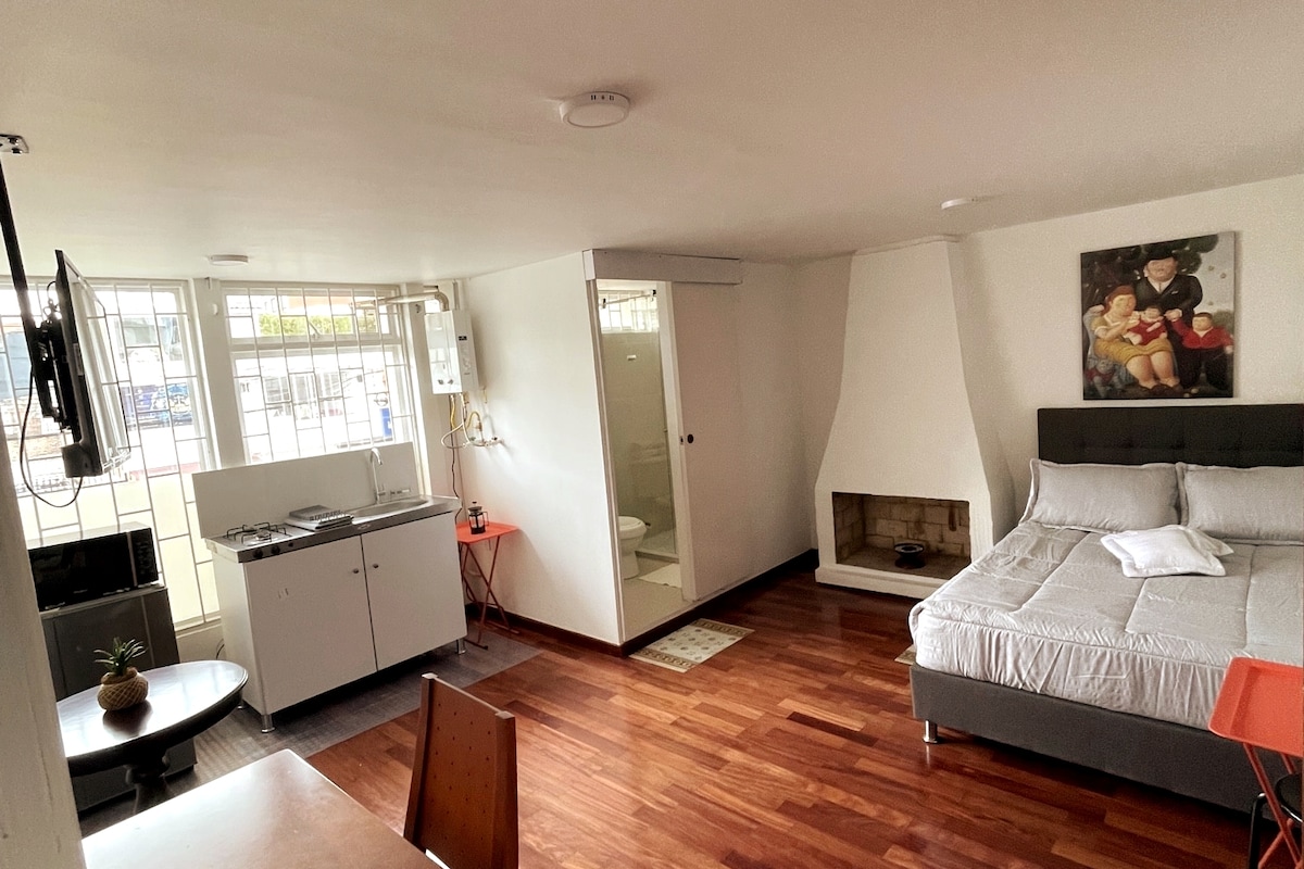 Stúdíóíbúð í risi með aðgengi allan sólarhringinn, staðsett á 11. hæð með ótrúlegu 180° útsýni yfir borgina, náttúrulegri birtu, nútímalegu og notalegu. Beint í Chapinero Central geiranum í nýrri byggingu, mjög nálægt bönkum, apótekum, matvöruverslunum, verslunarmiðstöðvum, veitingastöðum í Zona G og Zona T, Centro Internacional og La Candelaria, börum, leikhúsum, söfnum, El Campin Stadium og Coliseum, almenningsgörðum o.s.frv.