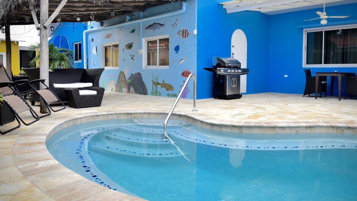 Þetta er nýuppgerð íbúð (staðsett innan 7 eininga hönnunarhótels sem er aðeins fyrir fullorðna) með öllum nýjum húsgögnum, heitu vatni og öllum þeim lúxus og þægindum sem þú býst við í stúdíói á háu stigi í Paradís. Á staðnum bjóðum við þér sundlaug, setustofu með grilli, (myntreknum) þvottahúsi og þvottalínum til að gera ferð þína til Arúba eftirminnilega og þú vilt koma aftur og aftur.