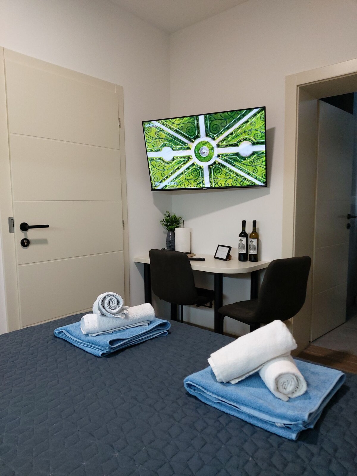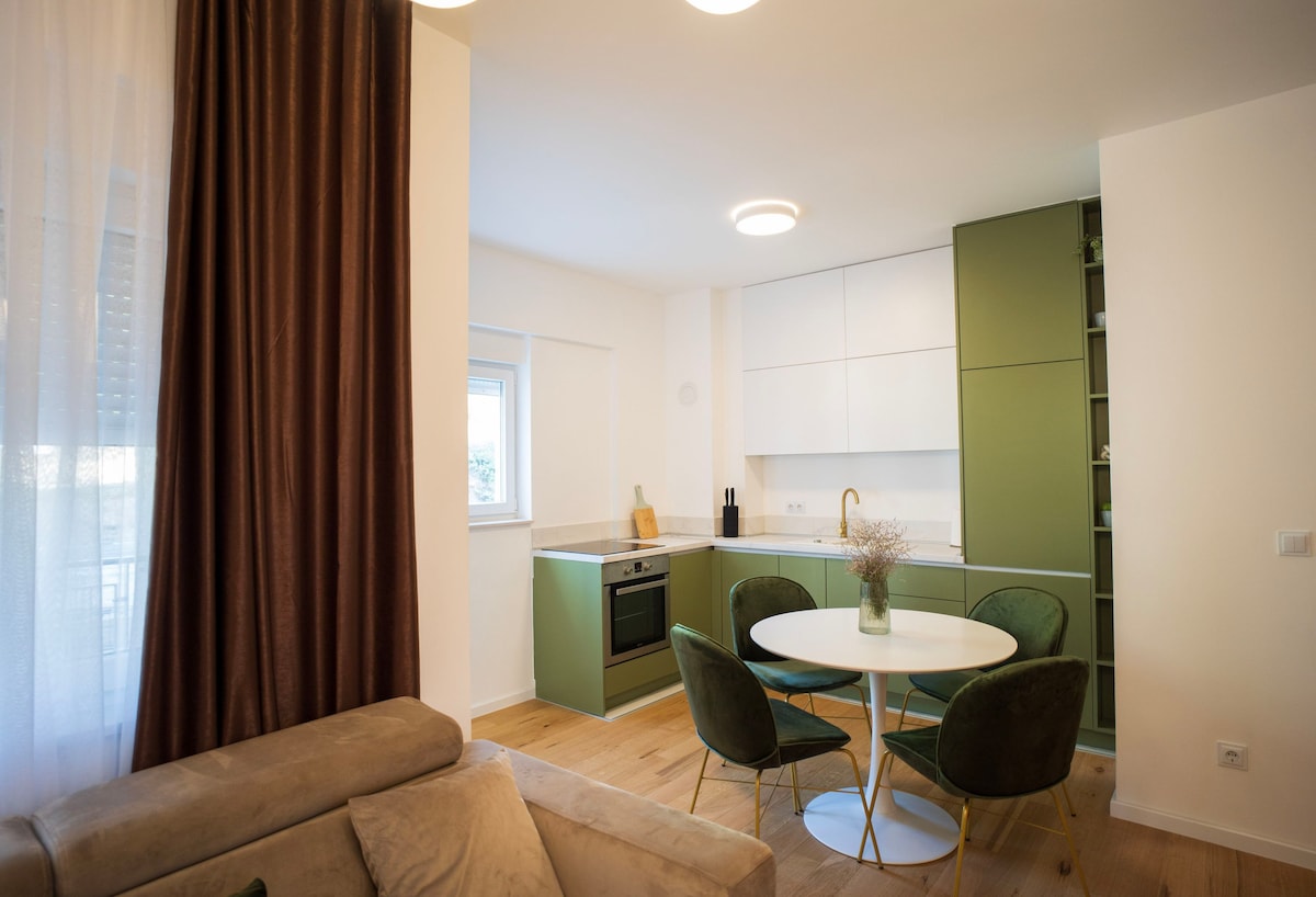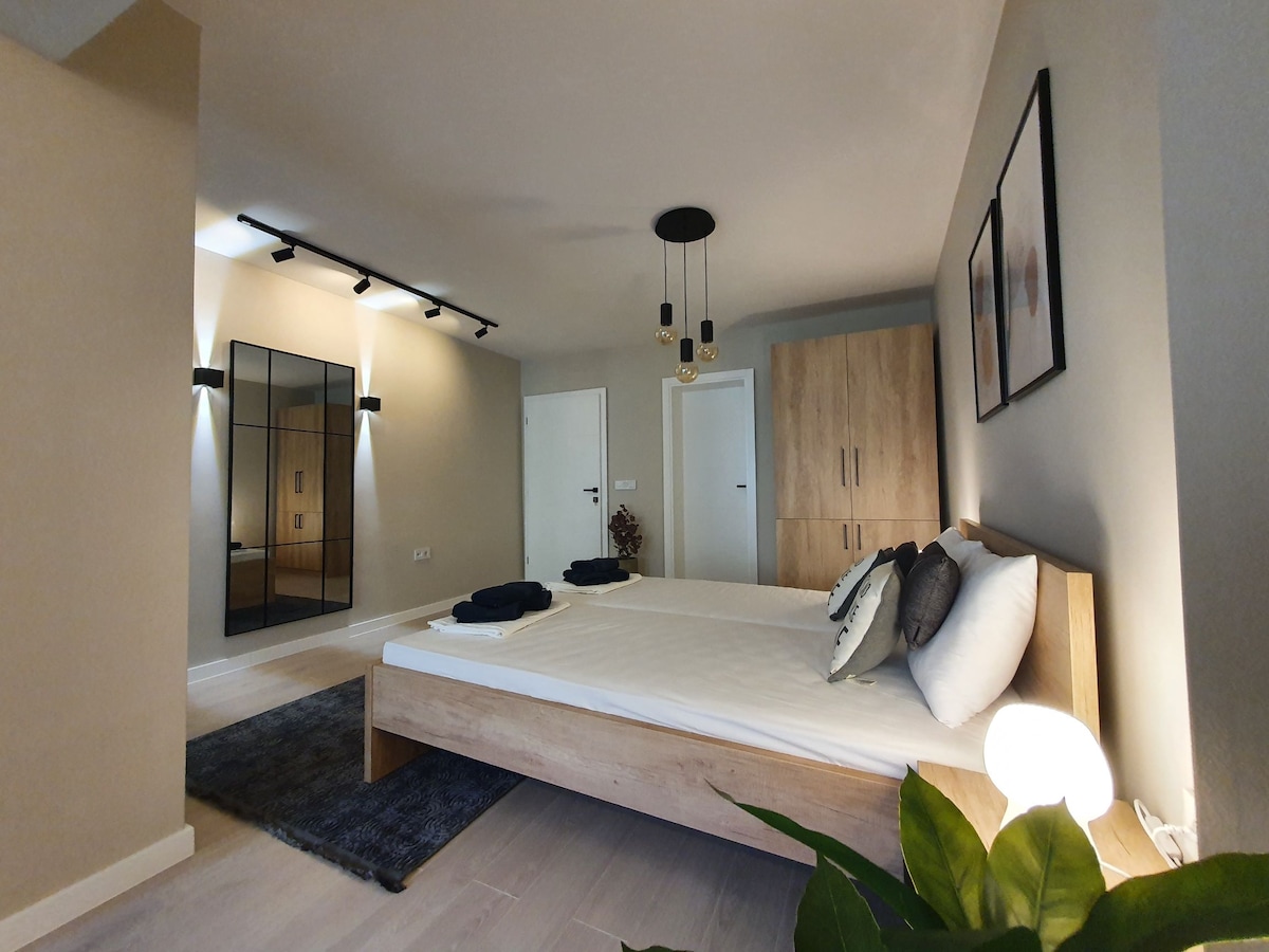 Enjoy a stylish experience at this centrally-located place in brand new building.The apartment consists of a bright bedroom with a comfy king-sized bed, dinning table for 4 persons and modern fully equipped kitchen. A sunlit living room with Smart TV. The pull-out corner in the living room can also serve as an additional bed for 2 more guests. The entire apartment was designed by architect (Adil Glavovic - axisarchiteture)