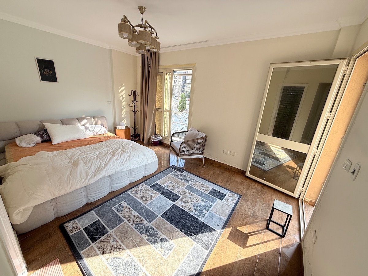Slakaðu á og njóttu dvalarinnar í þessari notalegu tveggja svefnherbergja íbúð í Nýja Kaíró, aðeins nokkrum mínútum frá American University í Kaíró. Í íbúðinni er einkagarður sem er fullkominn til að slaka á eða njóta morgunkaffisins. Öll þægindi eru innan við svæðið, þar á meðal kaffihús, veitingastaðir og verslunarsvæði. Fullbúið með þráðlausu neti, tveimur snjallsjónvörpum, loftkælingu í öllum herbergjum og stofunni, sjálfsinnritun og ókeypis bílastæði. Tilvalið fyrir fjölskyldur, pör og vinnuferðamenn.