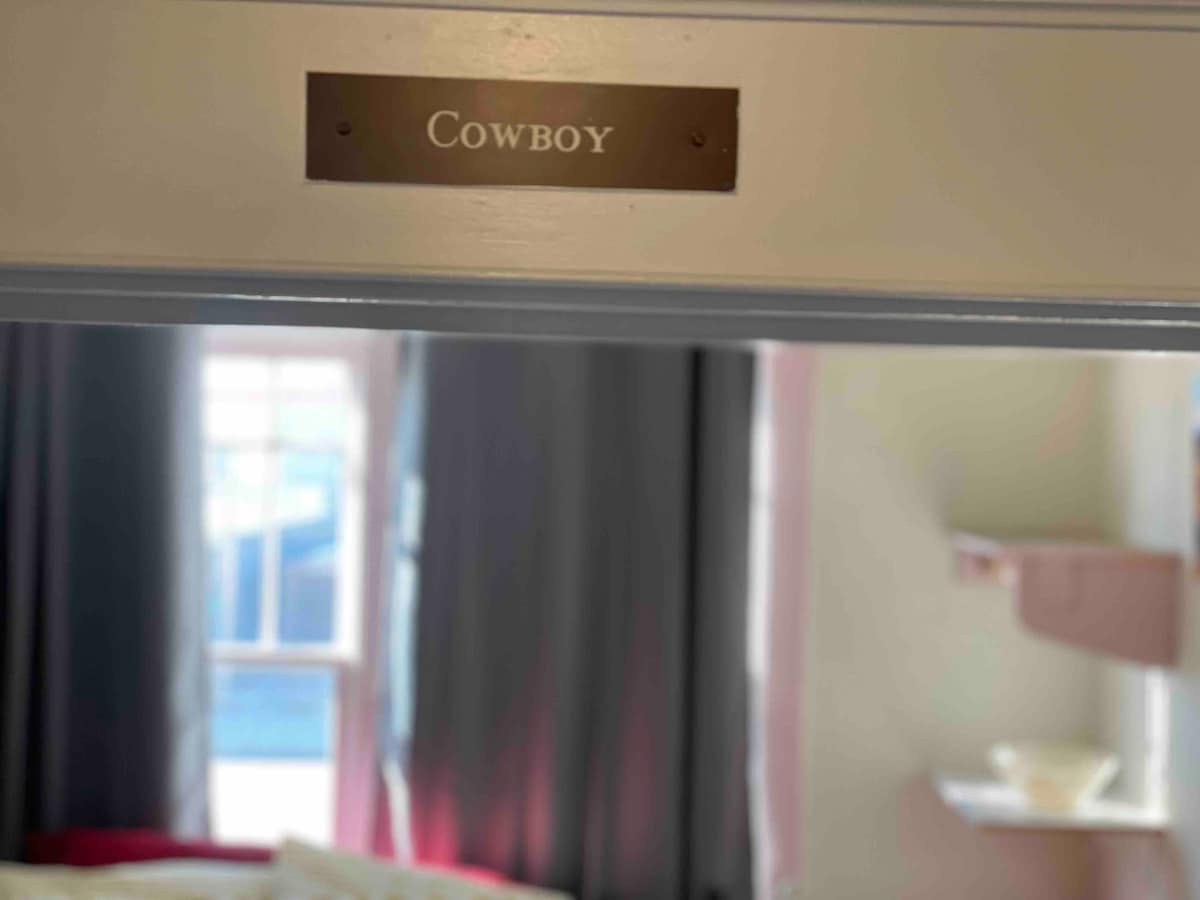 Front and center in the historic Brown is this cozy room with a view of the mountains and its own sink and vanity. Luxurious king/double twin bed and linens will make for a restful night. The cowboy room is next to the tv/living room with dining table and comfy loveseat. Steps down the hallway is the rose bathroom with walk in shower and quality Turkish towels and high end shampoo, conditioner and shower gel. The sleeping arrangement is a King a- Let us know if you want double twin.