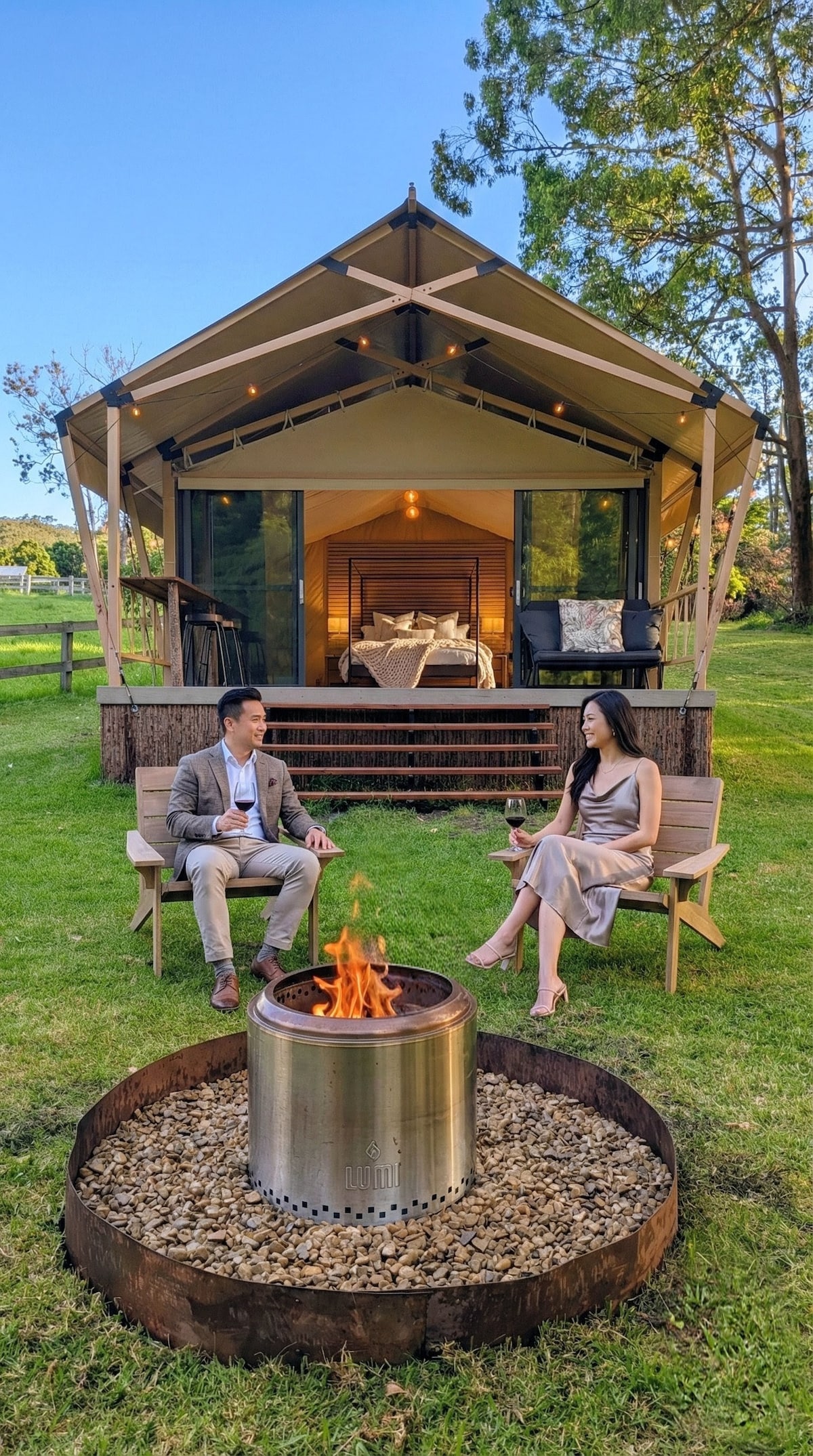 Escape to a luxury glamping retreat at Broke Estate, where nature meets comfort. Nestled in a private setting, you’ll enjoy a beautifully styled bell tent with premium bedding, a cozy seating area, and a record player. Your private amenities pod includes a full bathroom, kitchen, and daybed. Relax on the spacious deck, by the fire pit (seasonal), or with air-conditioning. Surrounded by nature yet close to Hunter Valley wineries, this is the perfect peaceful getaway.