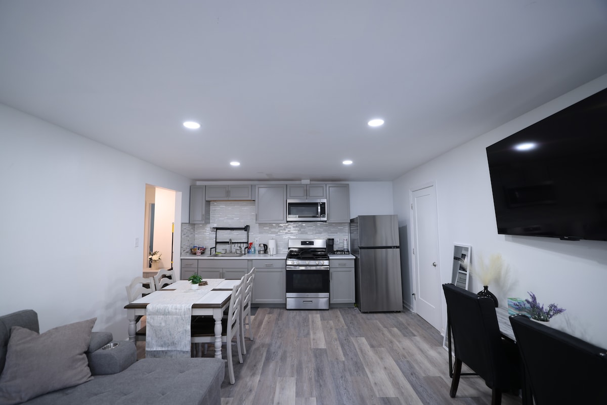 Njóttu þægilegrar dvalar í þessari notalegu íbúð í garðinum með bjartri stofu, fullbúnu eldhúsi og stóru svefnherbergi. Baðherbergið er nútímalegt, hreint og vel upplýst með loftræstingu til þæginda. Gestir hafa beinan aðgang að bakgarðinum; fullkominn fyrir morgunkaffi eða afslöppun eftir útivist. Þessi íbúð er þægilega staðsett nálægt rútutengingum til New York og í nokkurra mínútna fjarlægð frá Hoboken. Hún býður upp á friðsælt afdrep fyrir pör eða ferðalanga sem eru einir á ferð með greiðan aðgang að borginni.