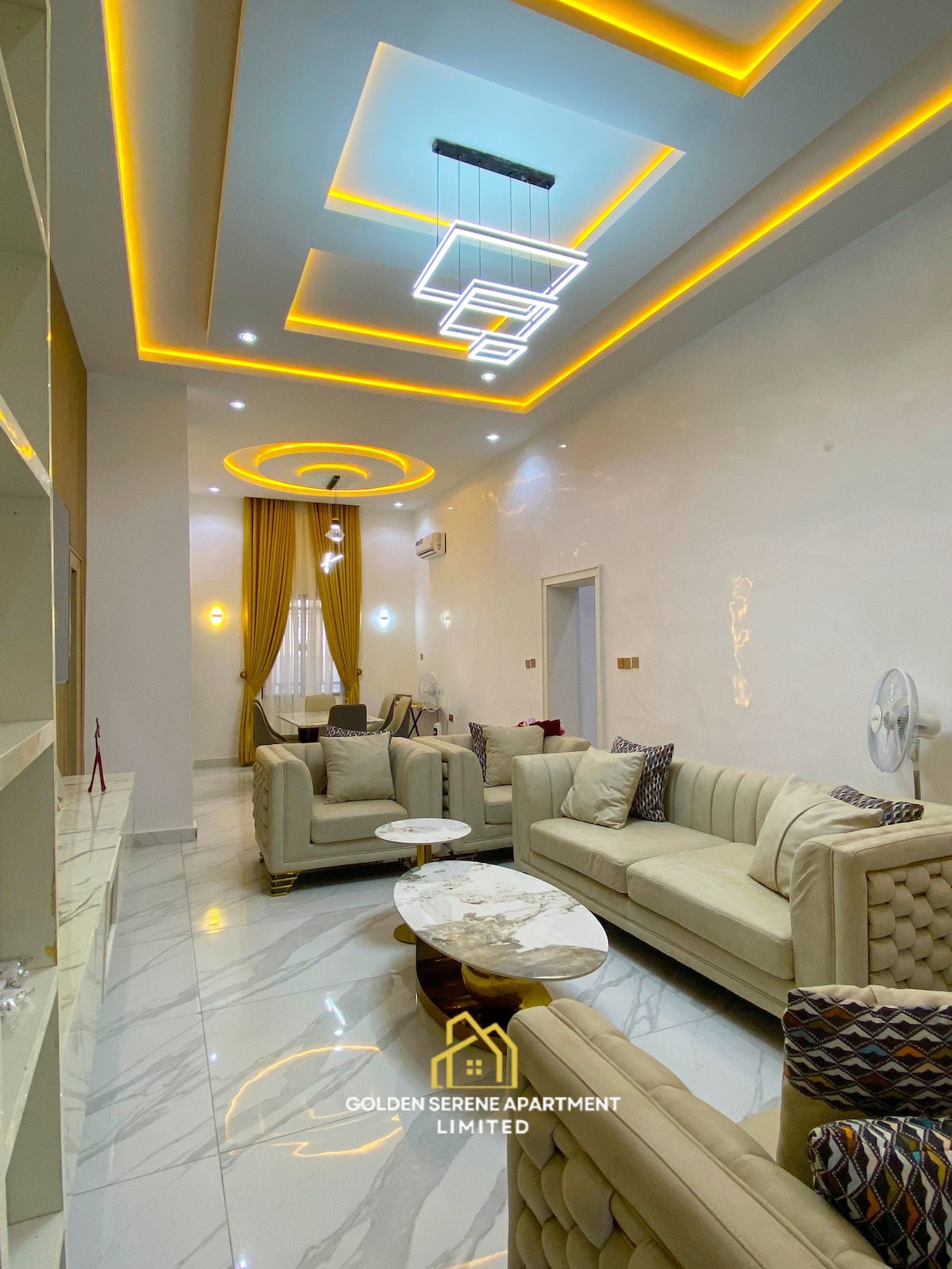 This unique place has a style all its oThis fully furnished 4-bedroom semi-detached duplex is designed to provide all the comforts of home, featuring pristine white walls complemented by vibrant accents. It comes equipped with top-quality amenities, including a fully stocked kitchen, washing machine, water heater, air conditioning, cozy bedrooms, 24-hour PS5 Wi-Fi, TV, DSTV, and a range of additional convenient features.wn.