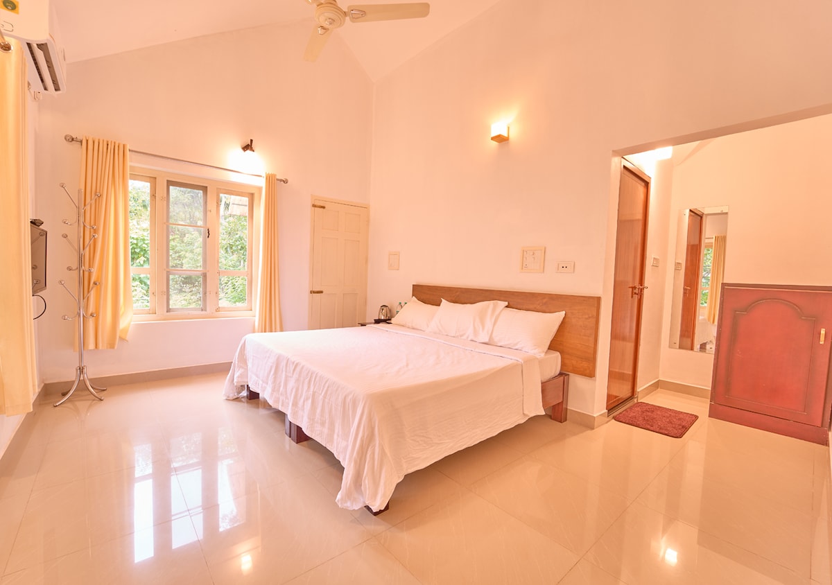 Teymið okkar beitti hönnunarhugsunarreglum til að búa til þennan nútímalega bústað. Notkun Laterite steina, terracotta flísar, þakflísar við innganginn, listilega hönnuðir gluggar í fullri lengd sem eru með útsýni yfir paddy reitina og rivulet Narsi úr hæð eru hluti af huglægri hönnun. Bústaðurinn er settur á hóflega hallandi landslag og býður upp á töfrandi útsýni. Premium sumarbústaðurinn er tilvalinn fyrir lúxus fjölskylduferð eða rómantískt afdrep. Staðurinn er umkringdur náttúruperlum.