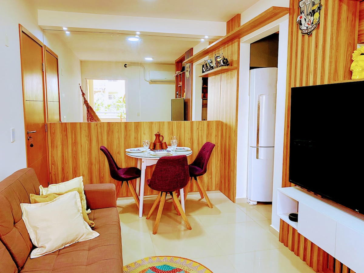 Rúmgóð og hagnýt íbúð í besta Condominio Clube á svæðinu. Það eru tvö svefnherbergi (1 svíta) með loftkælingu, stór borðstofa og stofa og útbúið amerískt eldhús. Þú getur notið fullkomins leysissvæðis með 6 sundlaugum, líkamsrækt, leikjaherbergi, heilsulind og öðrum þægindum. Allt þetta beint fyrir framan kyrrláta Praia do Cotovelo. Hin sanna paradís á jörð. Komdu og láttu þér líða eins og heima hjá þér!