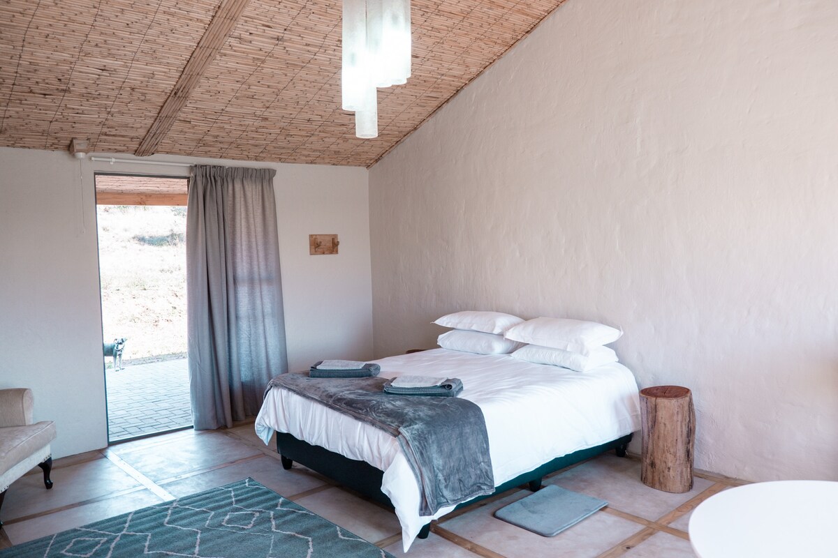 The open-plan self-catering unit are separate from the main house and features two single beds that are fitted with electric blankets with an on-suite bathroom , a dining table, and a kitchenette that is equipped with a two plate electric stove with a small oven, a fridge, a microwave, and basic utilities. The unit includes a 32-in flat-screen TV with premium DSTV channels and a remote operated ceiling fan. The unit has a hair-dryer and an iron.