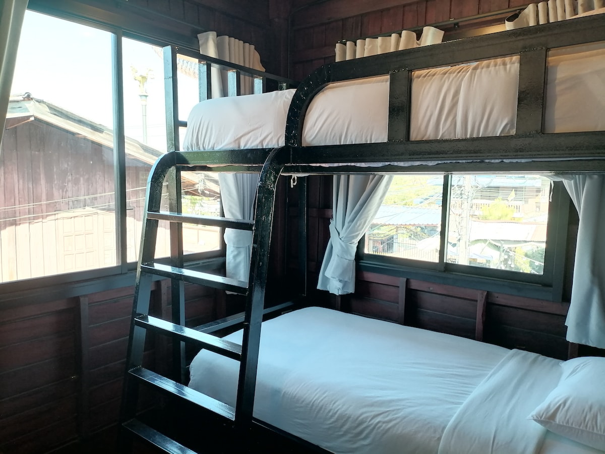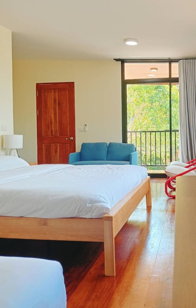 Notalegt tveggja manna herbergi (16M2) í glæsilegu sveitahúsi með síbreytilegu útsýni yfir Khao Leam-þjóðgarðinn; vel útbúið; eitt hjónarúm og eitt einbreitt rúm; nútímalegt baðherbergi (8M2); þægilegt, bjart, hreint, friðsælt og til einkanota; mínútur í kaffihús, dvalarstaði, veitingastaði, Mon bridge og markað; fullkomin undirstaða fyrir einstaklinga, pör eða vini sem eiga samskipti við náttúruna. Eldhús, stórt stofurými, ókeypis drykkir og snarl, ókeypis bílastæði, ÞRÁÐLAUST NET og sápur; mjög gagnlegt og einstaklega vinalegt.
