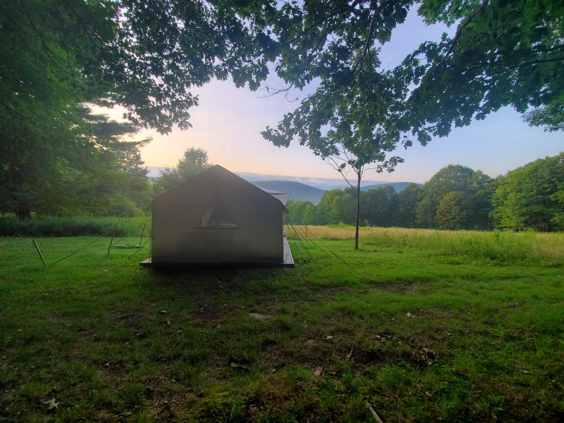 Við bjóðum upp á fallegan og ÞÆGILEGAN valkost til að tjalda. Á tjaldinu okkar eru öll þægindi heimilisins, þar á meðal viðareldavél og lestrarkrókur! Það er staðsett í hálslundi með útsýni yfir virku bæjartjörnina. Gönguleiðir og afþreying á staðnum við steinkast. Ef þú ert með lítinn bát eða kajaka skaltu KOMA MEÐ þá! Við erum með pláss í garðinum og marga staði á staðnum til að senda þér til að nýta þá vel. Ekki nota á tjörnina okkar. Við erum með bát til afnota.