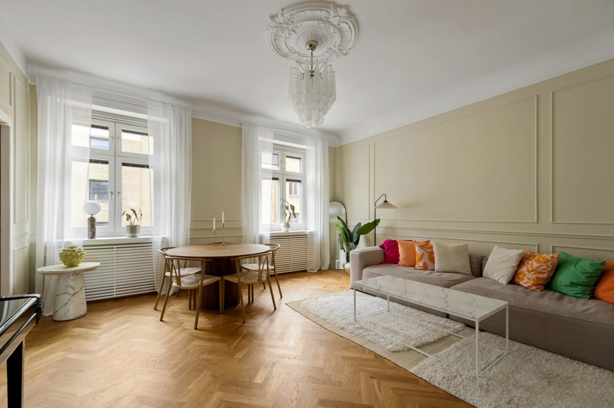 Nýlega björt og nútímaleg innrétting 100 M2. Íbúðin er nálægt verslunum og ýmsum veitingastöðum og krám. Íbúðin er björt og með innréttingu á hóteli með nútímalegri hönnun. Íbúðin hentar vel fyrir þig sem ferðast ein/n, fjölskylda eða í hópi tveggja manna. Íbúðin býður upp á ókeypis Wi-Fi Internet, tvö þægileg 160 cm breitt rúm, gott setusvæði og fullbúið eldhús. Íbúðin er björt og nýlega uppgerð og er fullkomin dvöl fyrir helgi eða lengri heimsókn hér í Stokkhólmi
