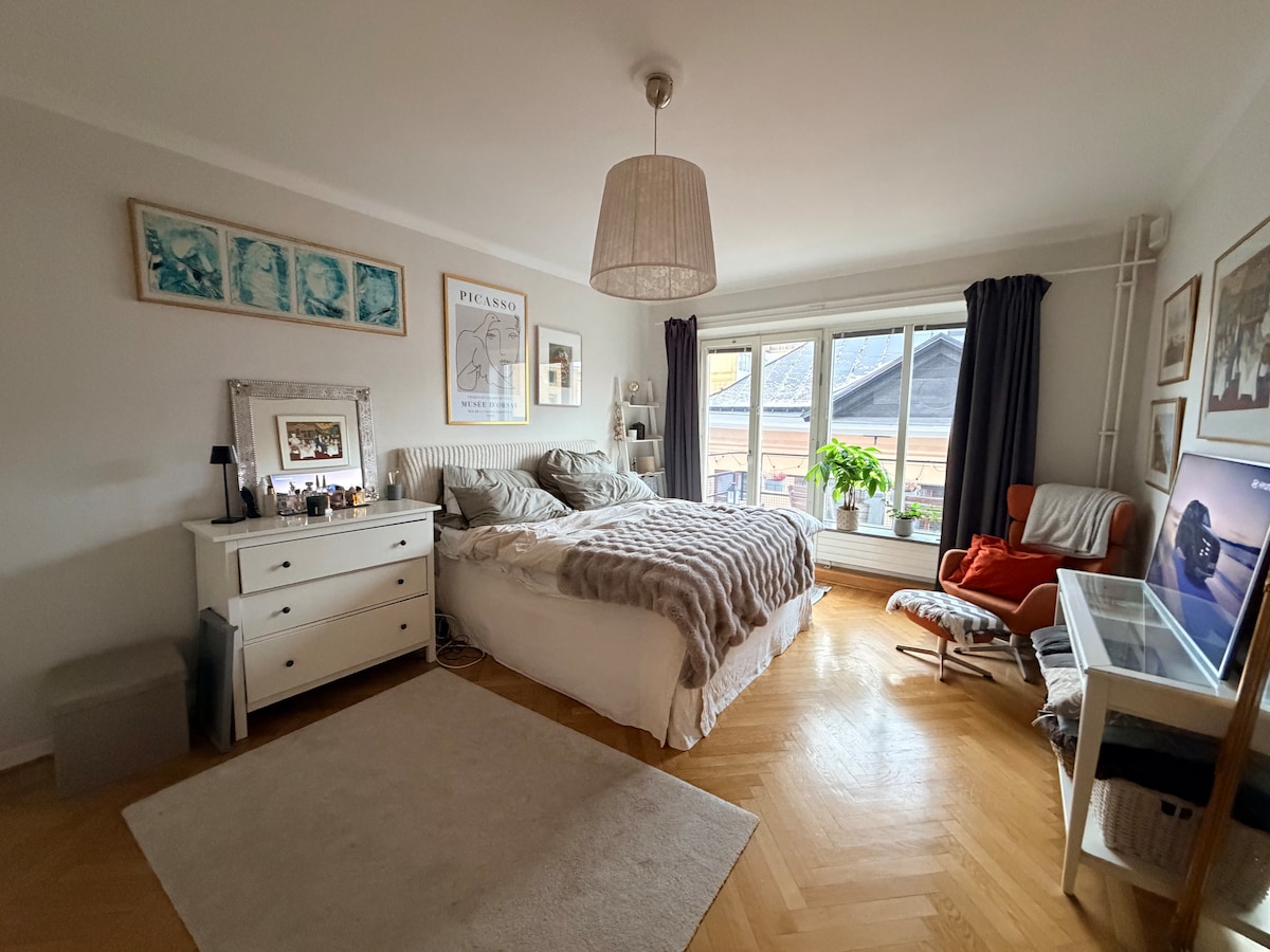 Rúmgóð íbúð á Södermalm með risastóru svefnherbergi með hjónarúmi og aðgangi að einkasvalir. Stór stofa með frönskum svölum sem býður upp á nægt pláss fyrir bæði setusvæði og borðstofuborð. Opið herbergi með 105 cm breiðu rúmi. Fullbúið eldhús og baðherbergi með baðkeri og þvottavél. Íbúðin er mjög miðsvæðis á Södermalm, rétt við Medborgarplatsen, þar sem verslanir, veitingastaðir og almenningssamgöngur eru rétt fyrir utan innganginn.