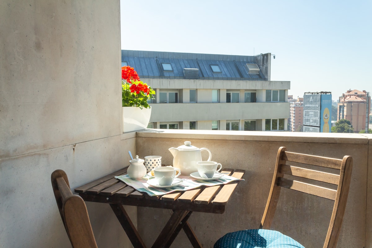 Velkomin (n) í björtu, opnu íbúðina mína á efstu hæð með frábæru útsýni yfir gömlu borgina í Portos, Douro-ána, hina frægu brú og portvínshúsin. Íbúðin mín er fullkomin fyrir tvö pör eða fjölskyldu (2 tvíbreið rúm) sem vilja stundum slaka á og elda kvöldmat heima hjá sér. Þegar börnin þín fara að sofa getur þú samt verið hluti af næturlífinu og notið útsýnisins af svölunum á meðan þú sötrar vínglas. Næg bílastæði við götuna en spurðu mig líka hvort bílskúrinn minn sé laus!
