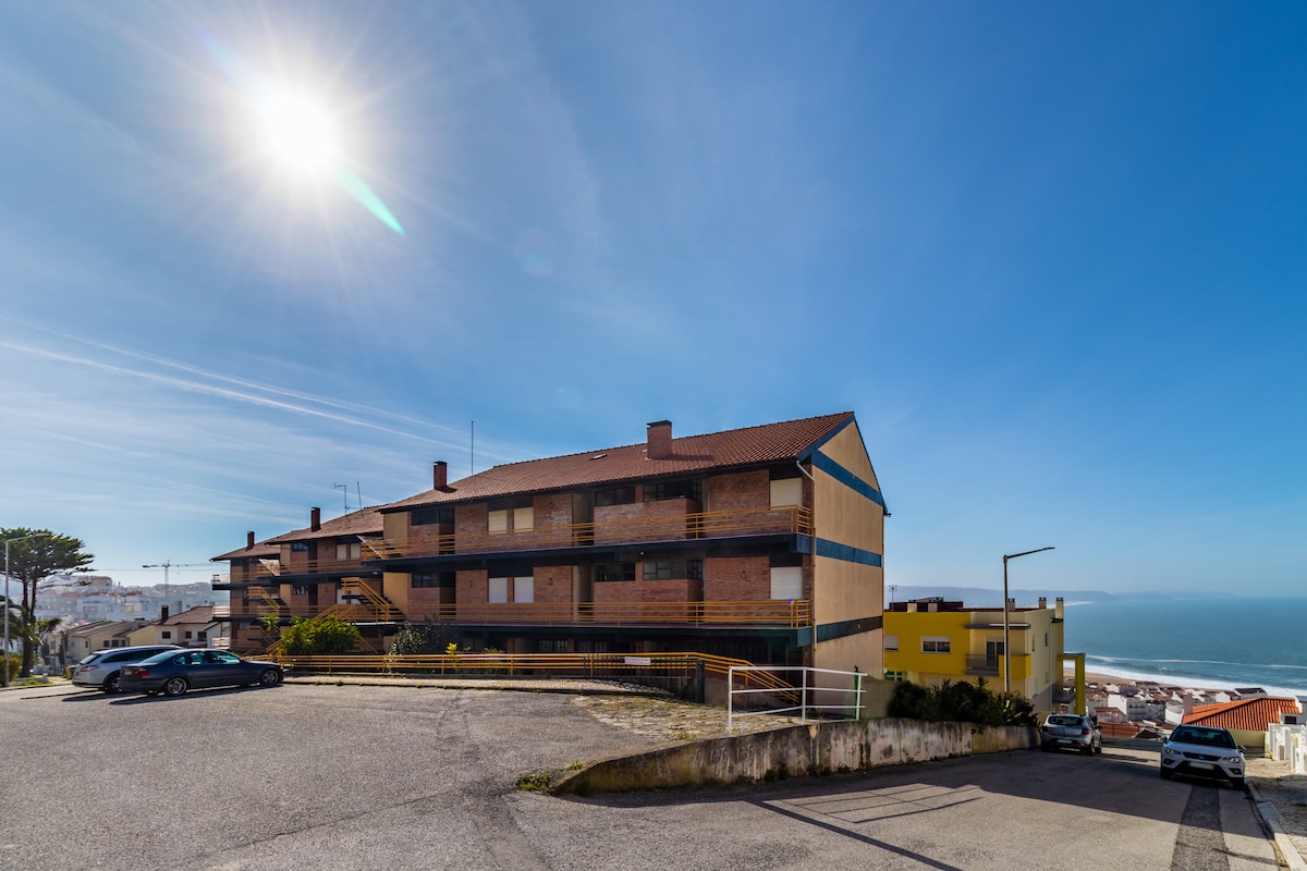Tveggja herbergja íbúð staðsett í einkaíbúð, síðasta húsaröðin sem snúa að vitanum/norðurströndinni og stærsta öldunni sem hefur farið á brimbretti. Á veturna (frá október til mars) gætir þú verið heppin/n að vera hér á sumrin (apríl til október) og á sumrin (apríl til október) getur þú notið sundlaugarinnar okkar. Óháð árstíð, sjávarútsýni er alltaf í boði, það er rólegt svæði á meðan þú ert í 5 mínútna göngufjarlægð frá miðbæ Sítio da Nazaré.