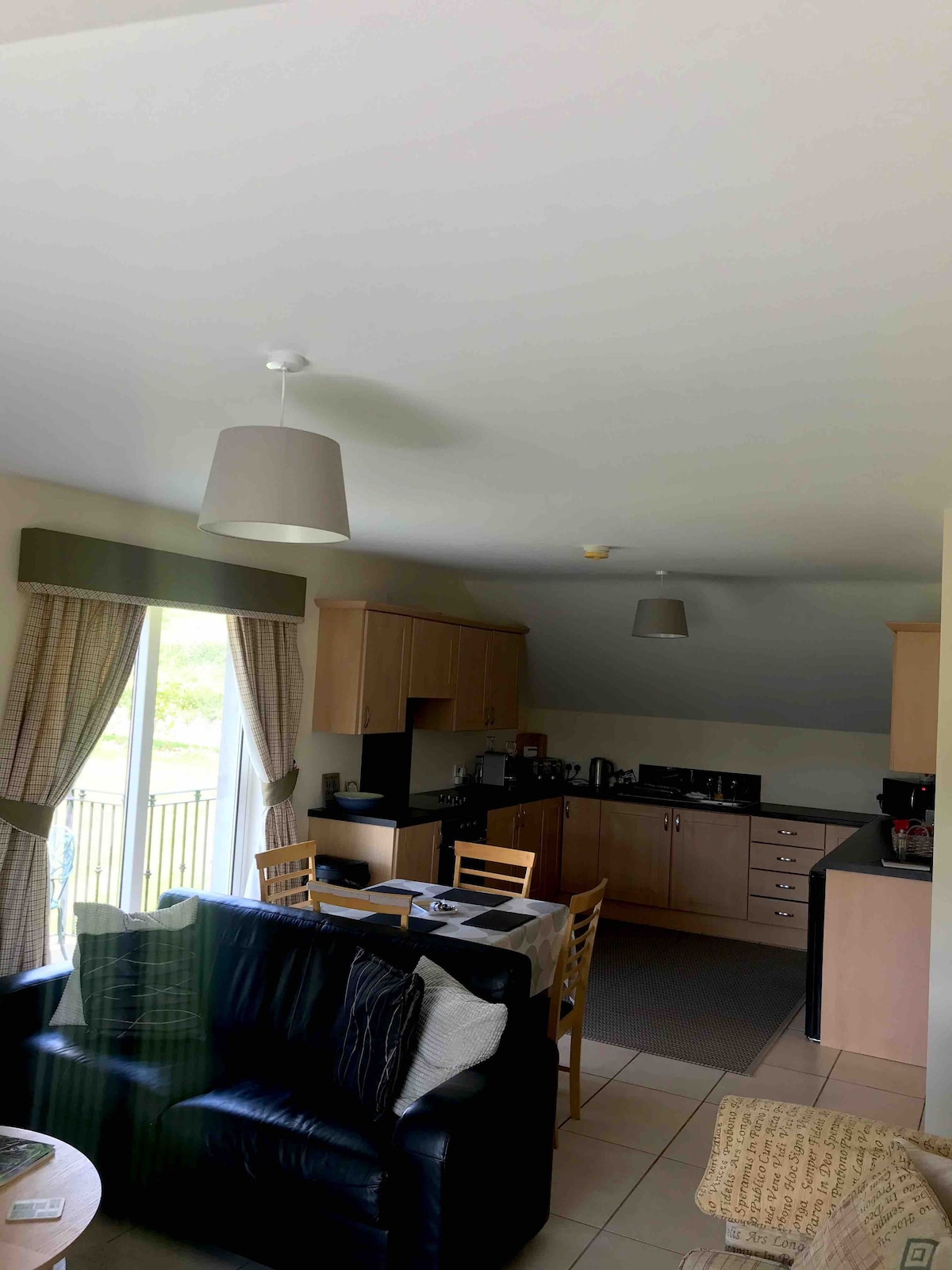 Gisting með eldunaraðstöðu með fjórum herbergjum. Allt nýlega skreytt með fullbúnu eldhúsi og borðstofu með fallegu útsýni. Teppalagt stofa með fallegu útsýni, 45" sjónvarp, hjónaherbergi og stórt baðherbergi með rafmagnssturtu. Við búum í landi 15mins frá flugvellinum, 3 mílur til Antrim og Randalstown með verslunum, veitingastöðum og krám. 25 mínútur til Belfast og 45 mínútur til North Coast. Castle Gardens er í aðeins 5 mínútna akstursfjarlægð með fallegum görðum og gönguleiðum að lough ströndinni.