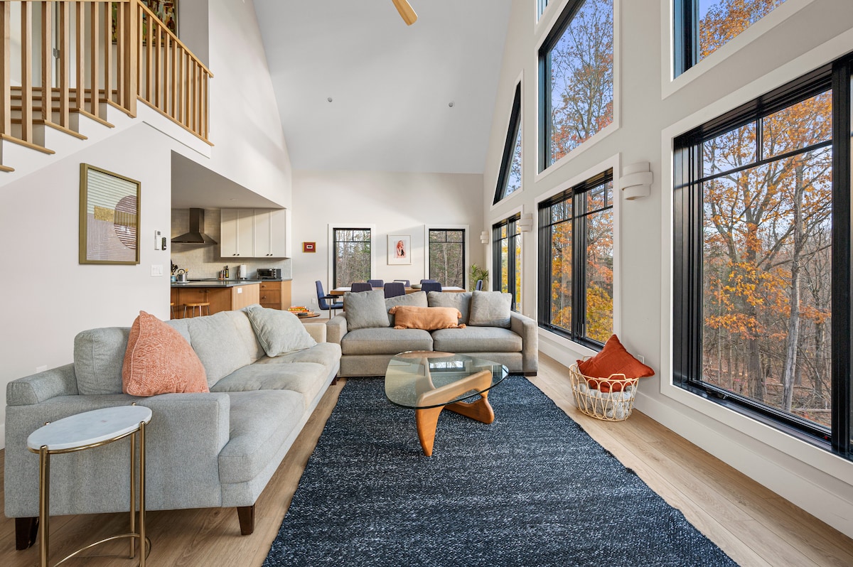 Á toppi Silver Mountain, útivera í einkaskógi með útsýni yfir Hudson-dalinn. Njóttu náttúrunnar með meira en 200 fuglategundum, jóga, hugleiðslu eða kyrrlátum lestri í fersku og stökku fjallaloftinu Hratt þráðlaust net, 60 tommu háskerpusjónvarp og viðarofn. Slakaðu á á risastórri verönd með bólstruðum legubekkjum til að stara á stjörnurnar og grilla kjöt. Á haust-, vetrar- og vorárstíðum er kalt, snjór, ís og frosinn jarðvegur. Þú samþykkir að þú sért á lóðinni á eigin ábyrgð