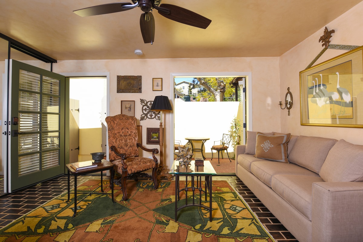 Enjoy peaceful, sunny San Diego days as palms sway above this private garden retreat tucked behind a 1925 Craftsman. Designed with a love of nature and simple beauty, the guest house opens onto lush greenery and dappled light — a calm, creative hideaway in the heart of one of San Diego’s most charming neighborhoods. Just a short stroll brings you to great restaurants, world-class breweries, and cozy coffee shops, while Balboa Park, the Zoo, the beaches, and downtown are all only minutes away.