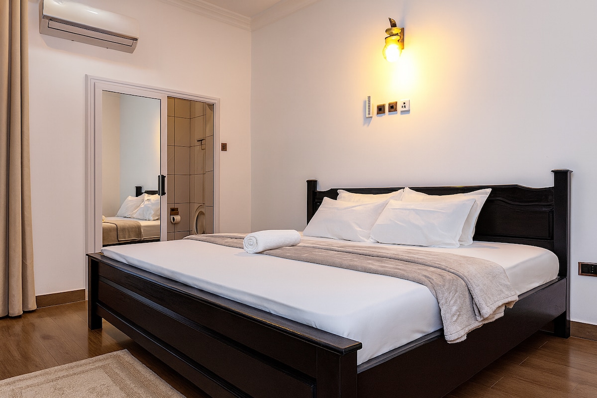 Í hjarta Accra býður lúxusíbúðin okkar með tveimur svefnherbergjum upp á fullkomna blöndu af þægindum, stíl og þægindum. Tvö rúmgóð svefnherbergi, glæsileg nútímaleg baðherbergi með öllum nauðsynjum og stofa fullkomin með þægilegum sófa, 60" sjónvarpi, þráðlausu neti og Netflix Eldhúsið er búið nútímalegum tækjum og eldunaráhöldum. Íbúðin okkar er staðsett á öruggum, miðlægum stað í Adabraka Accra, í göngufæri við líflega markaði, ljúffenga veitingastaði á staðnum og sögufræg kennileiti.