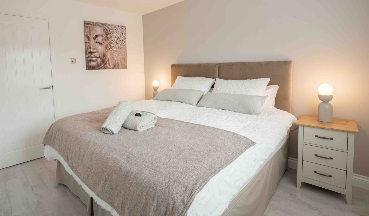 Friðsæla hundavæna heimilið okkar að heiman er með sveitina við dyrnar með nóg af göngu-/hjólaferðum o.s.frv. * Einkagarður sem ekki er litið fram hjá með grilli og setusvæði * Kingsize rúm, Netflix, Sky TV, WiFi og Air con eining fyrir hlýrri mánuði * Einkabílastæði * Eftirlitsmyndavélar á útidyrum og bakhlið * Á þessu miðlæga heimili er fjöldi áhugaverðra staða í stuttri akstursfjarlægð og krár á staðnum Við erum ekki lengur með heitan pott fyrir gesti sem koma aftur