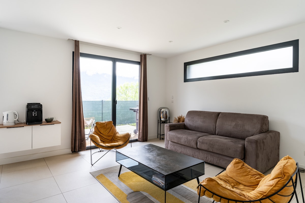 27 m² duplex🏡 stúdíó flokkað ⭐️ Atout France & Gîtes de France, 5 mín frá miðborg Albertville. Loftkæling❄️, þráðlaust net⚡, Netflix🎬, vel búið eldhús🍳, þvottavél🧺. Rúm búið🛏️, handklæði til staðar🧼. Fjallasýn, ⛰️ ekki litið framhjá, frátekin bílastæði🚗. Drykkir + kaffi☕, madeleines, kex og briochettes í boði🥐. Sjálfsinnritun🔑. Tilvalið fyrir skíði🎿, gönguferðir🥾, hjól 🚴 og Annecy-vatn🌊. Kyrrlátt andrúmsloft, óhefðbundin gistiaðstaða🌟.
