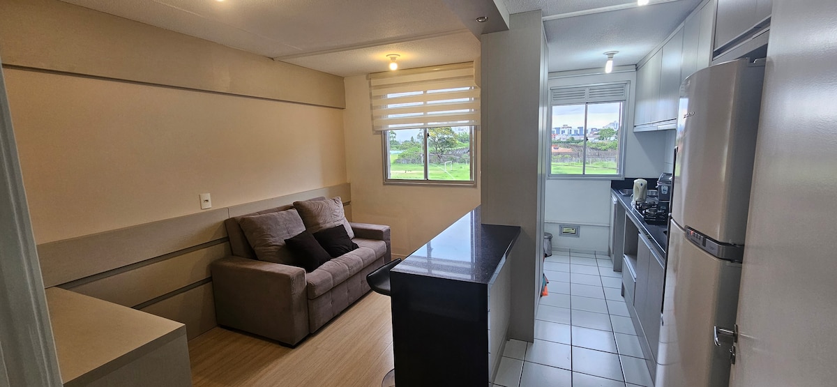 Tveggja svefnherbergja íbúð á jarðhæð, tilvalin fyrir fjölskyldur eða fjarvinnu. Í hverju herbergi er vinnustöð sem tryggir þægindi og afkastagetu. Íbúð með fullkomnum innviðum: sundlaug, íþróttavelli og leikvelli. Forréttinda staðsetning í miðbæ Canoas með greiðan aðgang að flugvellinum í Porto Alegre og öllu stórborgarsvæðinu. Loftkæling í báðum herbergjum.
