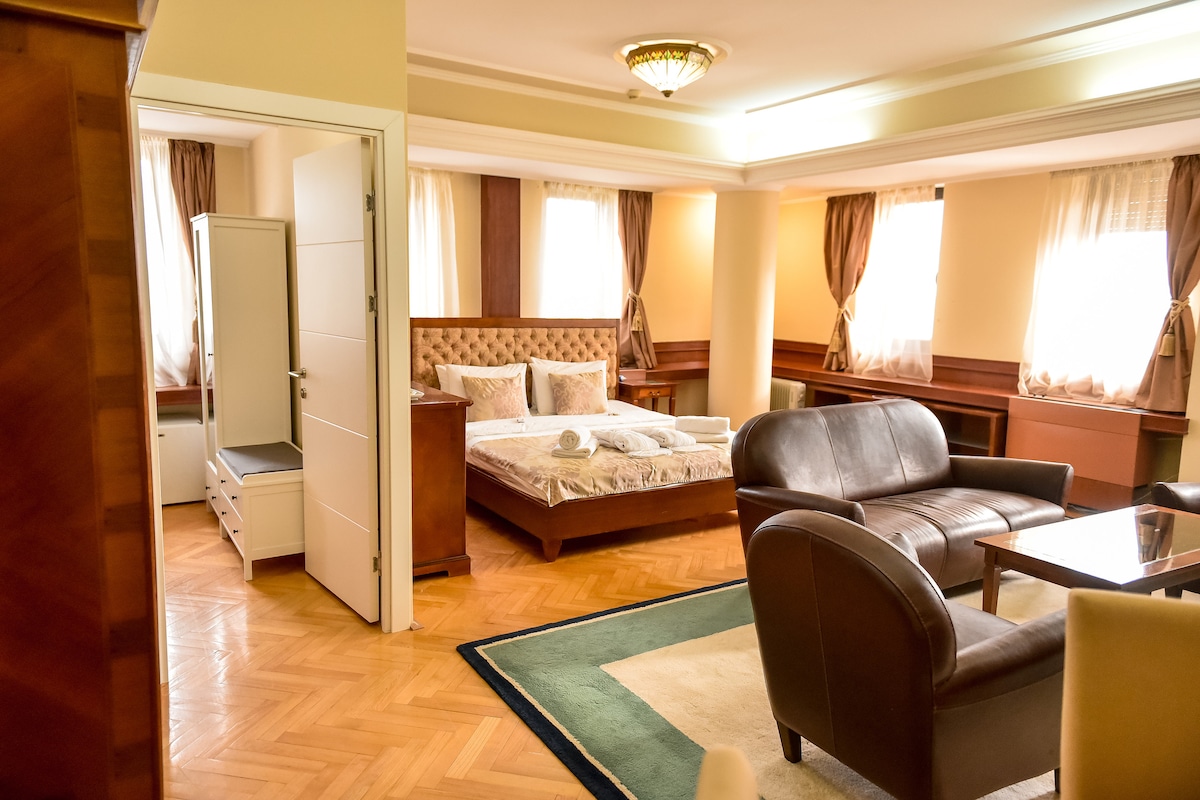Dobrodosli u nas De lux apartman. Apartman se sastoji iz dve odvojene spavace sobe,trpezarijskog dela,moderno uredjenog kupatila i posebnog radnog kutka. U prvoj sobi se nalazi francuski lezaj dimenzija 165cm x 200 cm dok druga nudi prostrani king size krevet za vrhunski komfor. Gostima je na raspolaganju Wellnes postavka sa bade mantilima,papucama i peskirima.U apartmanu Vas takodje ocekuje i deo za osvezenje : kafa,cajevi i flasirana voda.